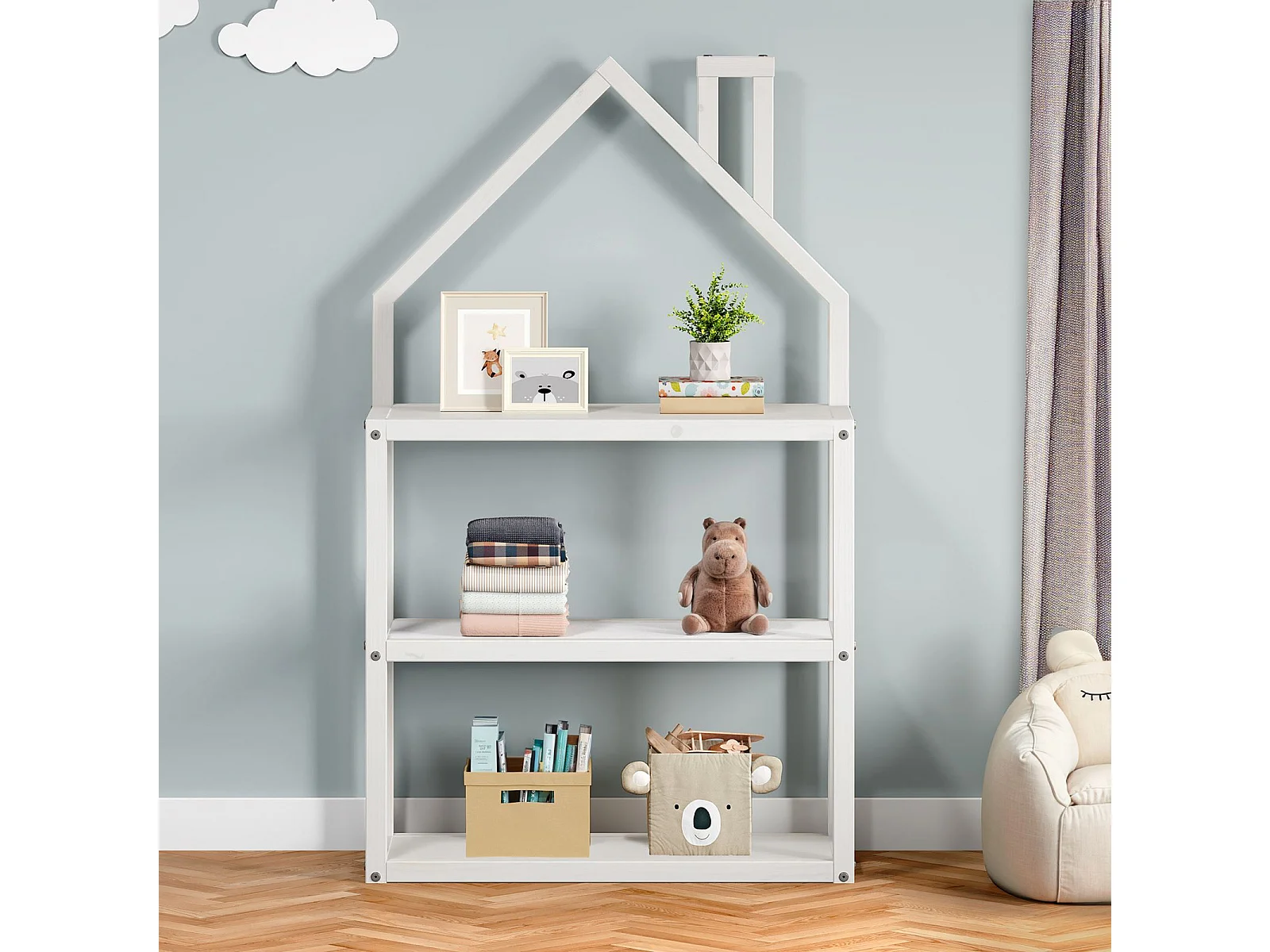 Étagère enfant LENISE en pin massif, meuble rangement chambre enfant en forme de maison en bois lasuré blanc
