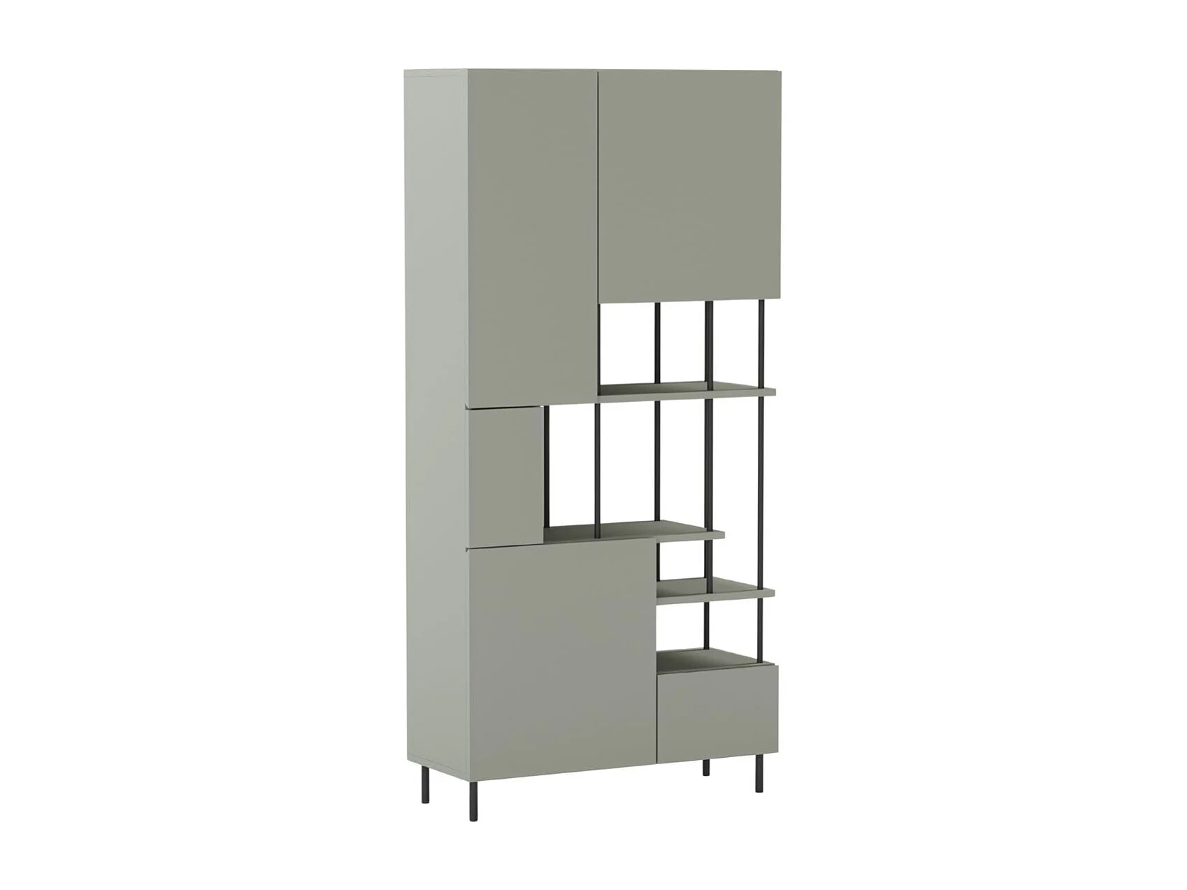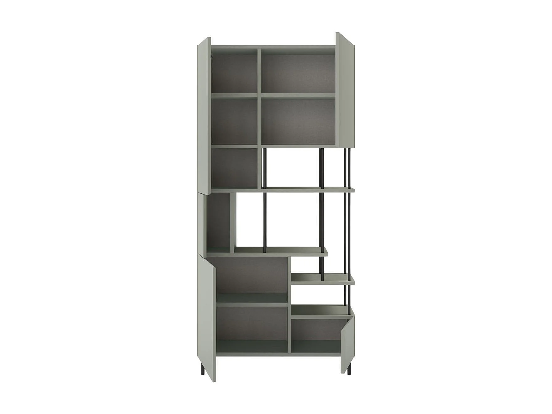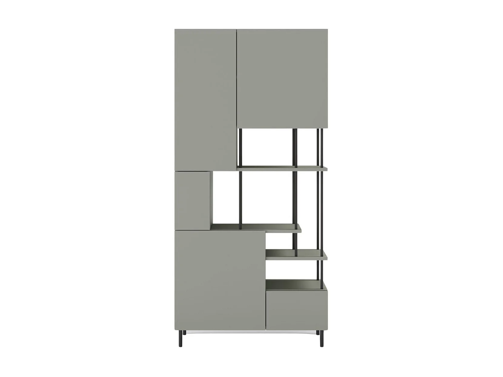 Etagère graphique et asymétrique semi-ouverte 5 portes en mélaminé vert sauge et métal noir - MANEL
