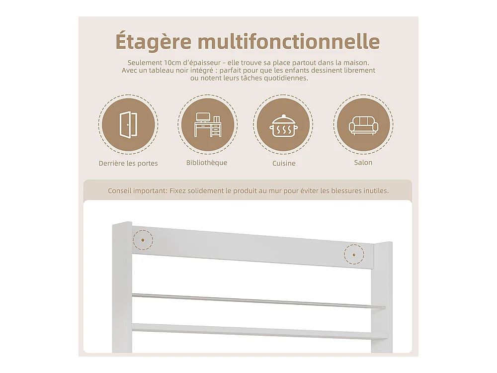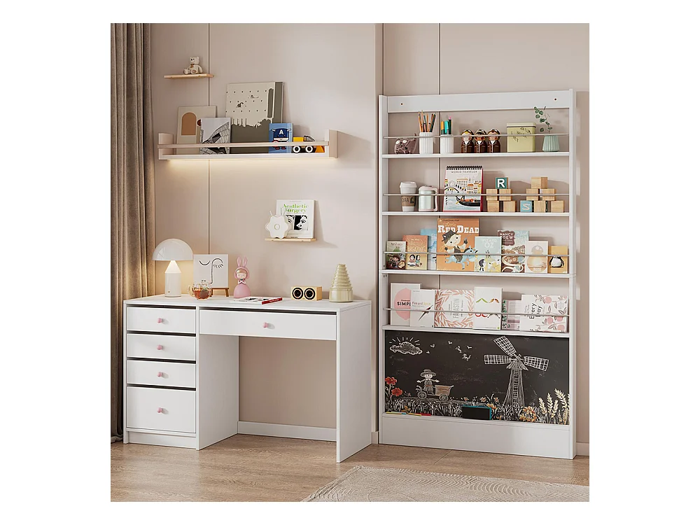 Étagère de rangement d'enfant - 100 x 10 x 180 cm - à 4 niveaux + tableau noir à peindre - MDF + Métal - blanc