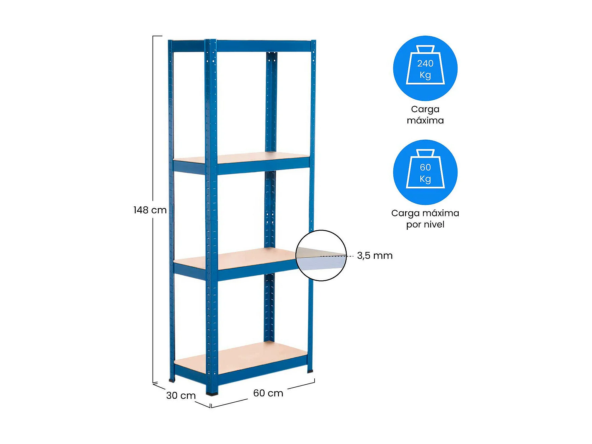 Etagère Métallique avec 4 Tablettes Ajustables 148x60x30cm 240 Kg Bleu Thinia Home