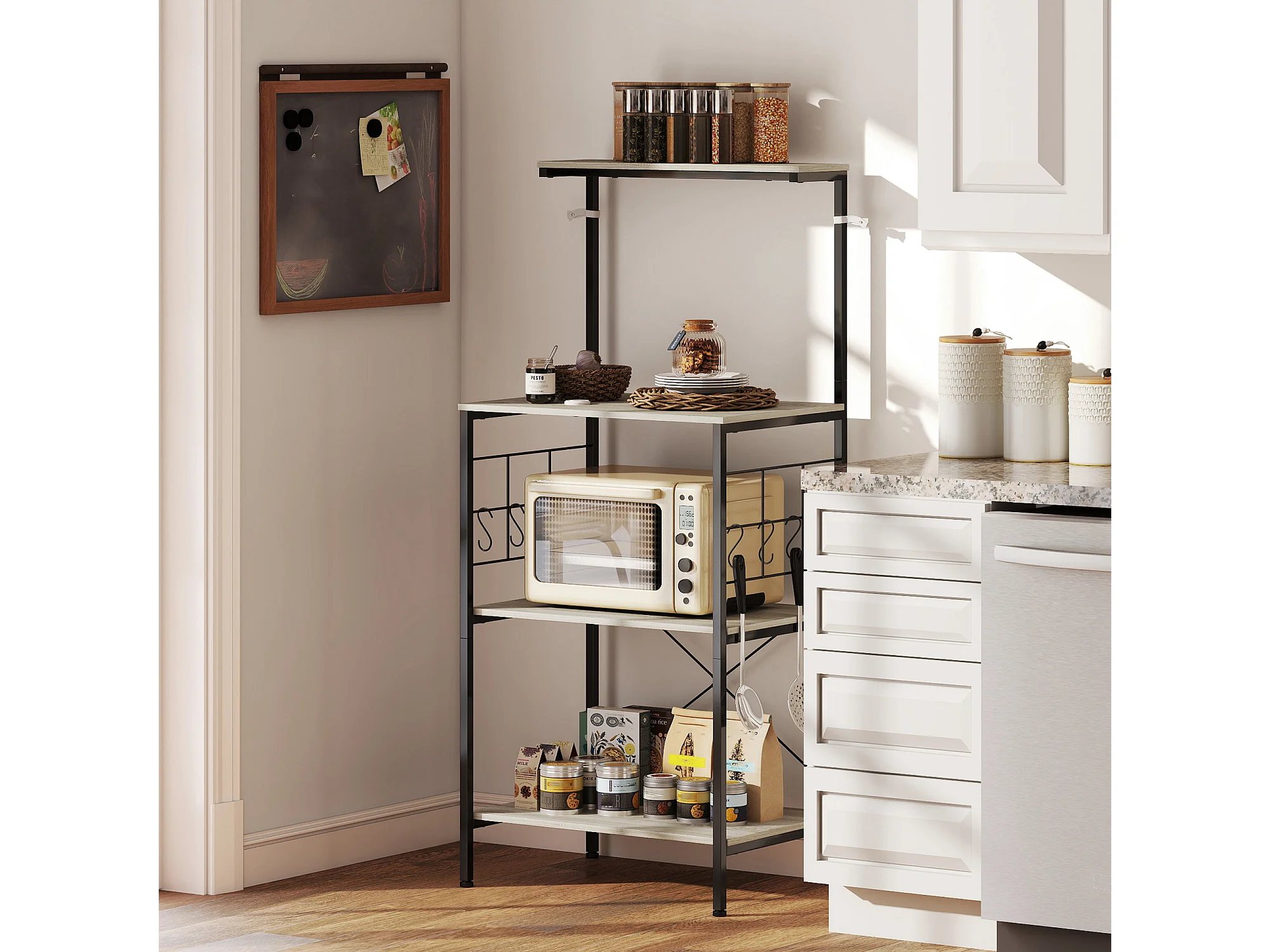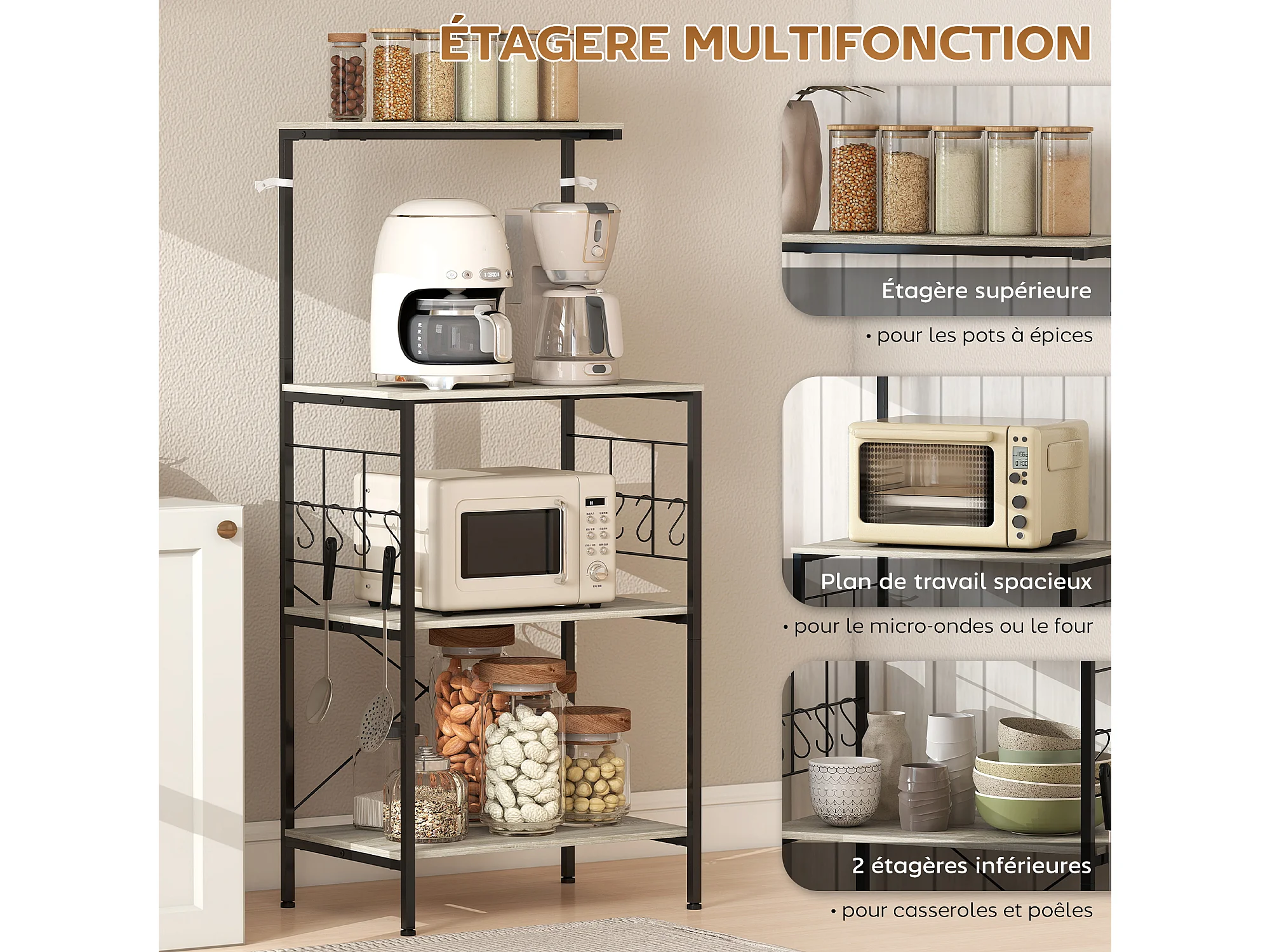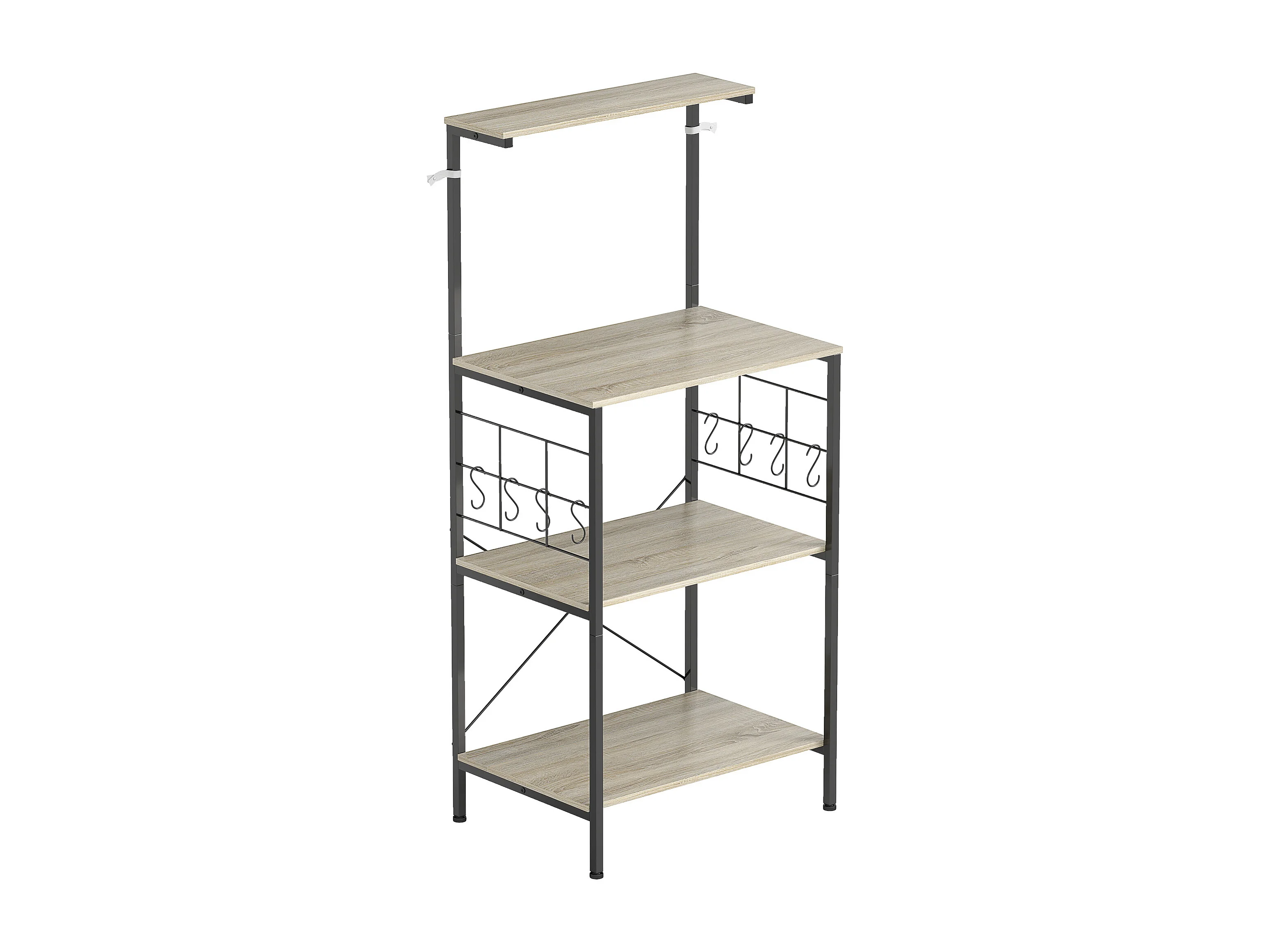 Étagère micro-ondes 8 crochets 4 étagères dim. 60 x 42 x 134,5 cm métal noir effet bois clair