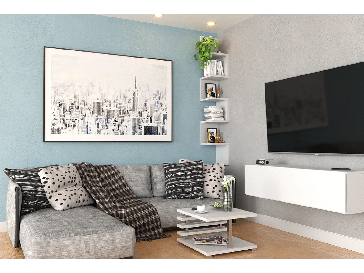 Étagère murale d’angle suspendue blanche – bibliothèque pour livres, jouets, style loft 22x142 cm
