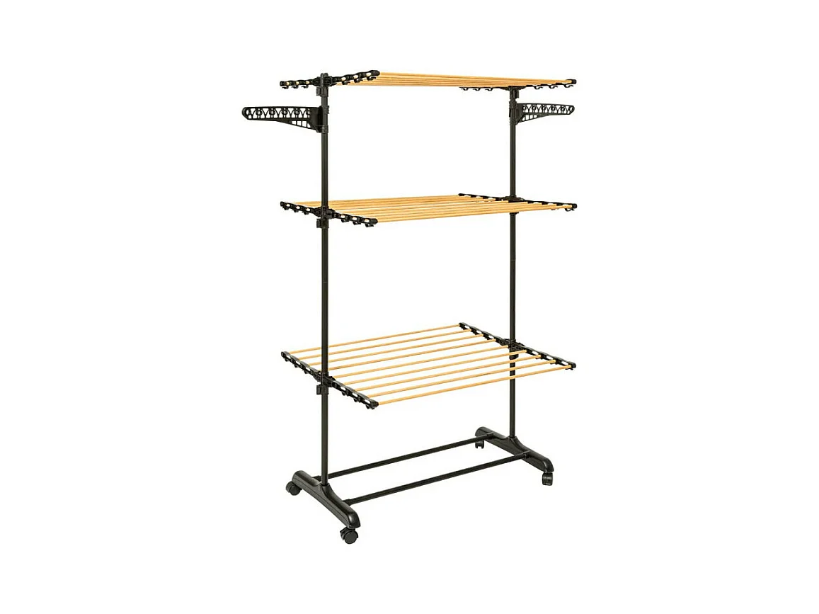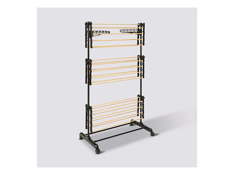 Etendoir Pliable à Roulettes 3 Niveaux Coloris Noir et Effet Bois - LINEO