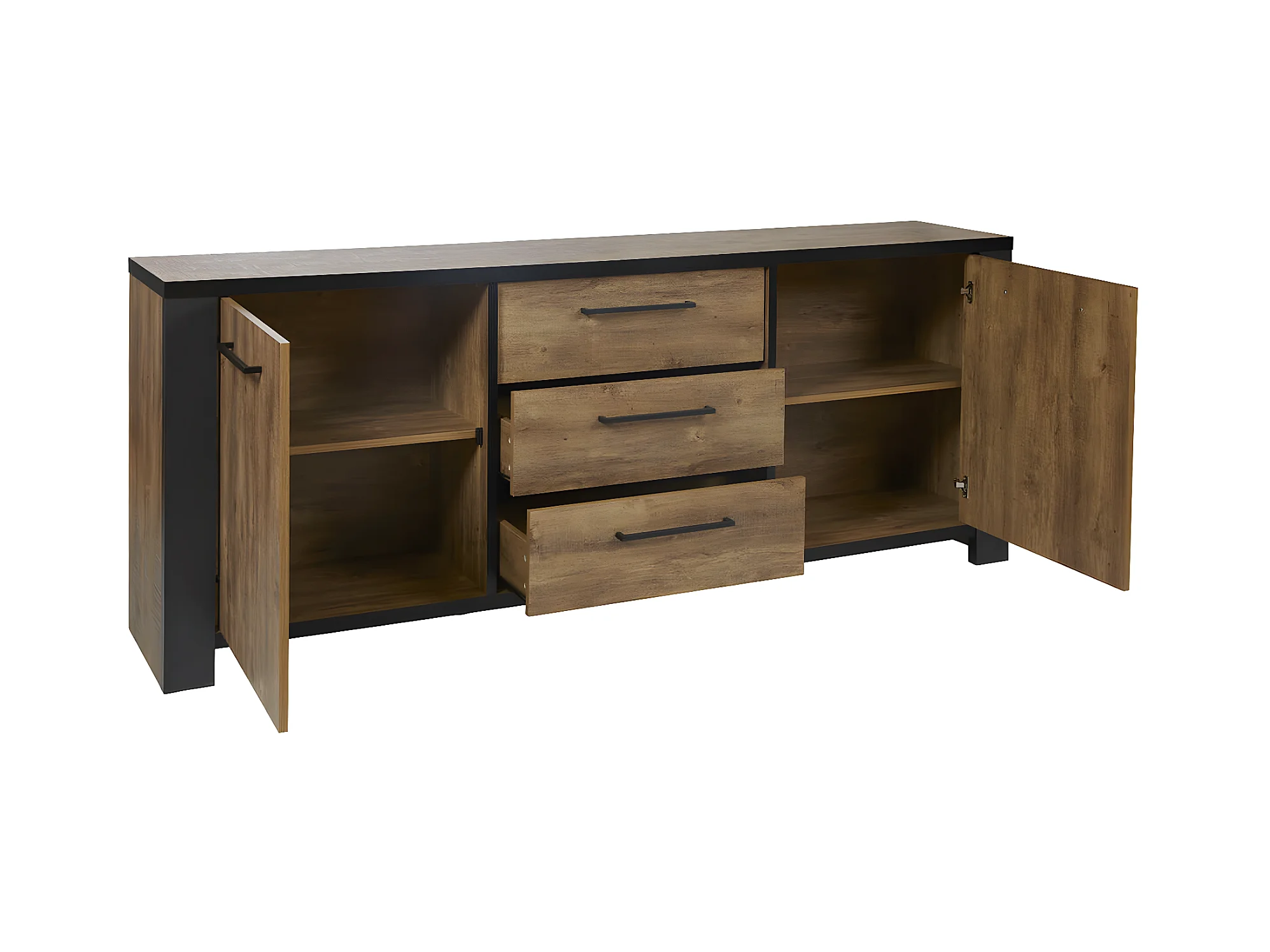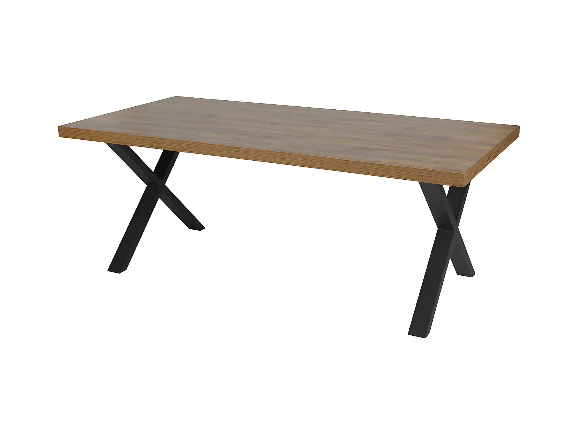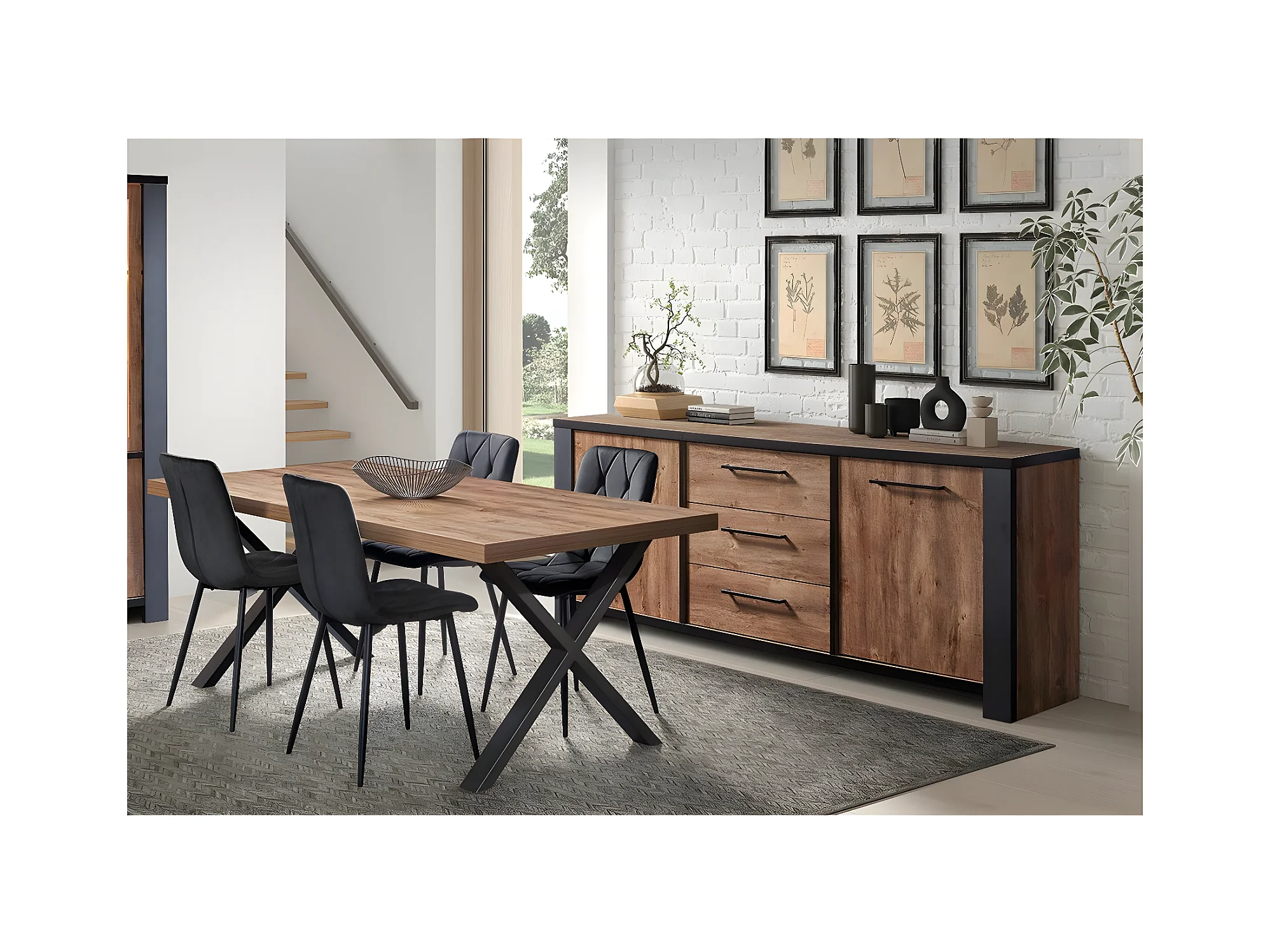 ETIENNE - Ensemble Séjour Buffet et Table 200cm Aspect Bois Piètement X Métal Noir