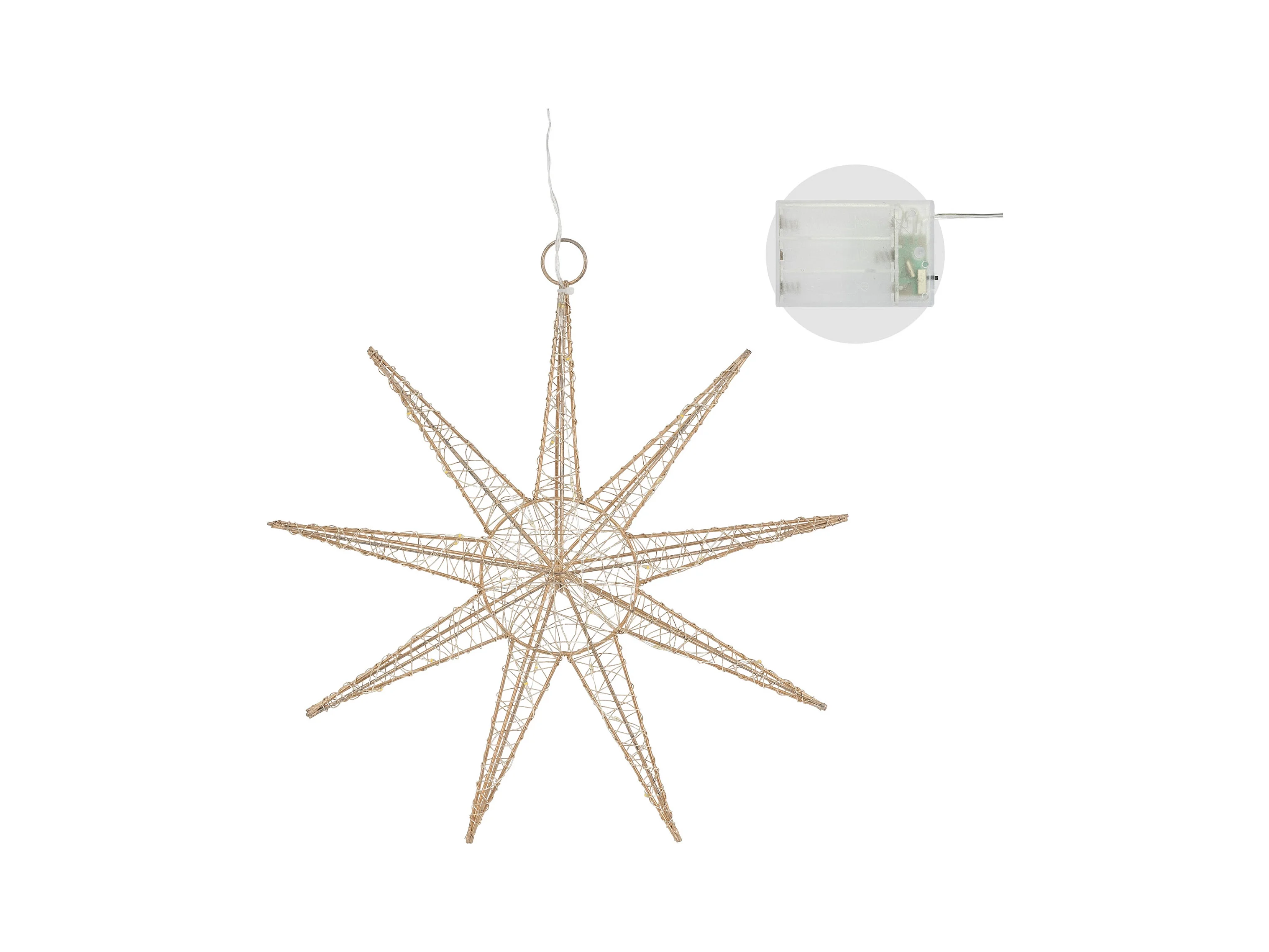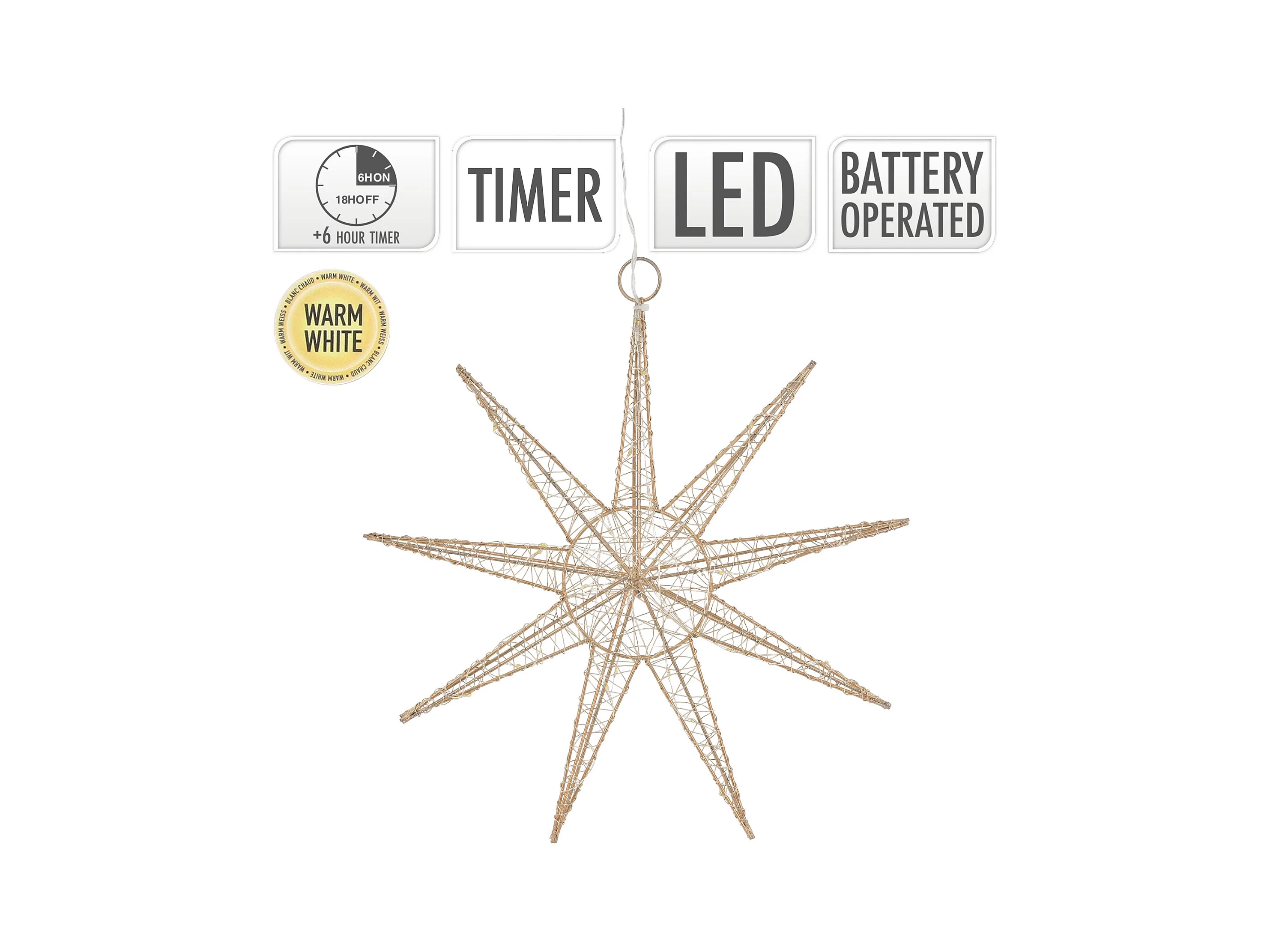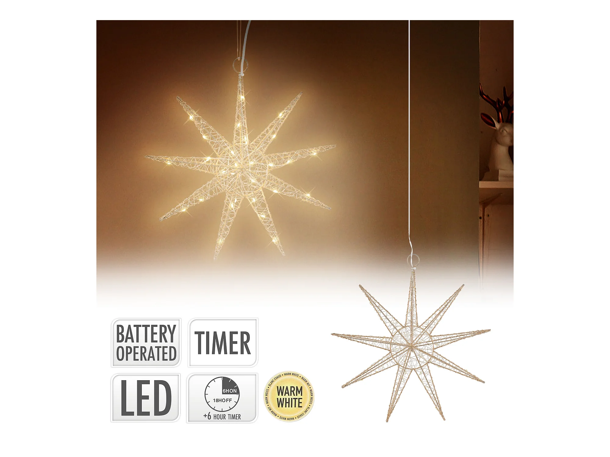 Étoile de noël décorative à suspendre 30 cm dorée avec 30 led blanc chaud en métal avec éclairage et minuterie à piles ornement de noël pour fenêtre
