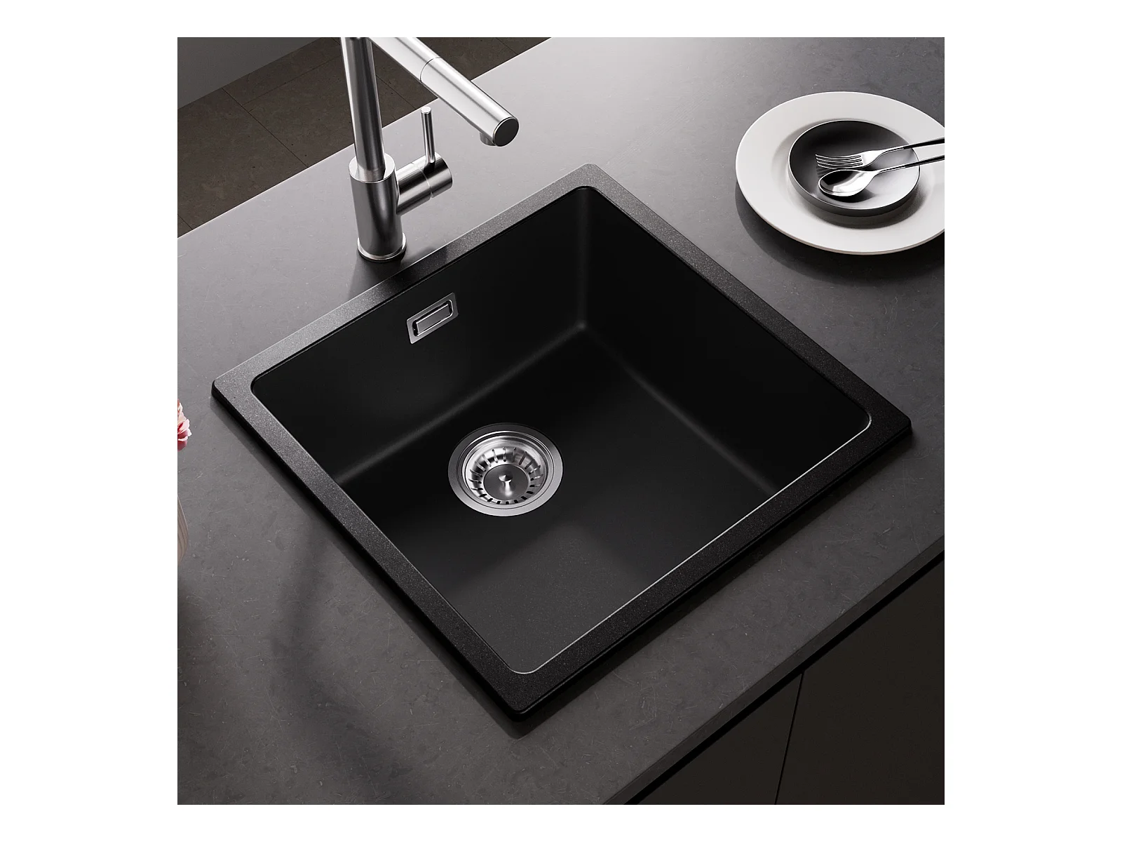 Evier 1 Bac en Quartz et Résine, 3 Options de Montage, 45*44*20cm + Mitigeur de Cuisine Rabattable Noir