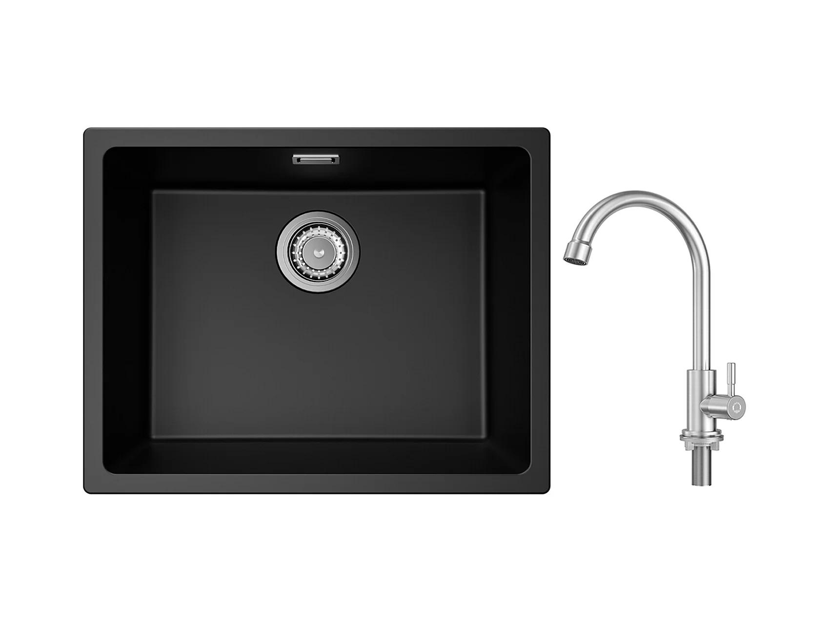 Evier 1 Bac en Quartz et Résine, 3 Options de Montage, 55*44*20cm + Mitigeur de Cuisine en Inox Noir étoilé avec Bec Haut et Incurvé