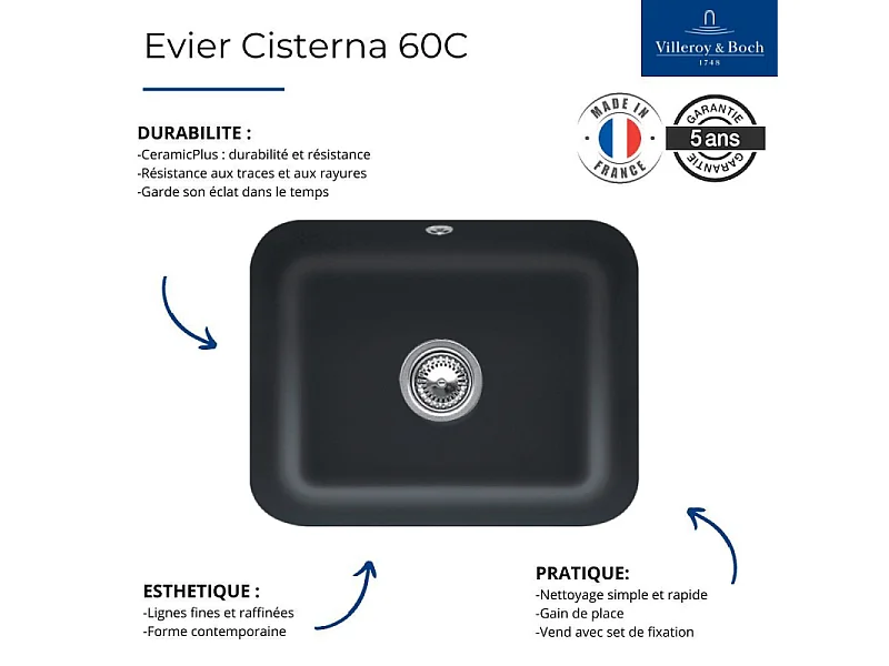Evier 1 bac Villeroy et Boch Cisterna 60C Pure Black CeramicPlus