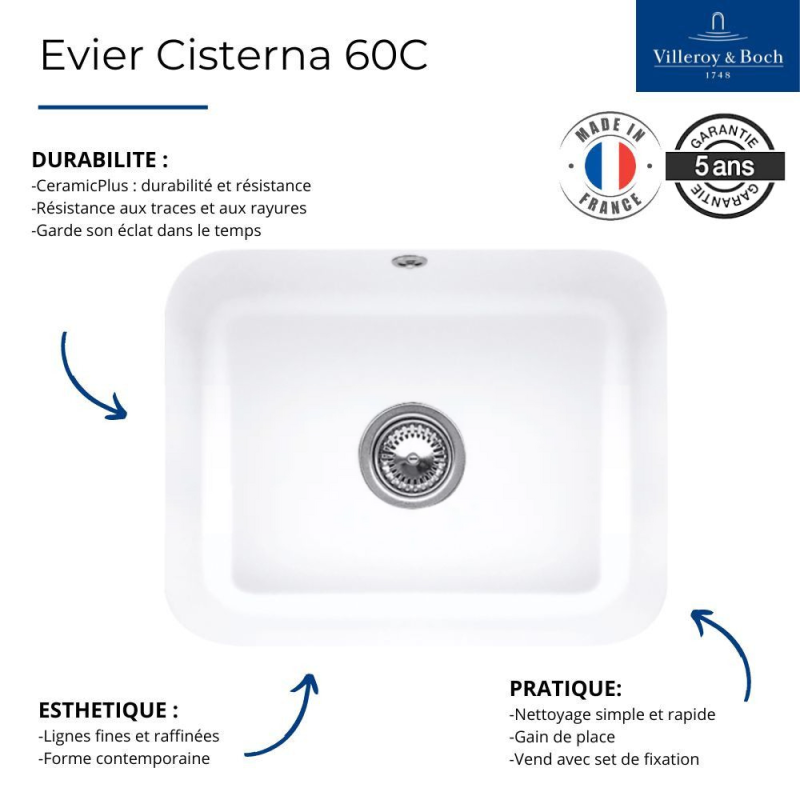 Evier 1 bac VILLEROY ET BOCH Cisterna 60C Timber CeramicPlus avec vidage manuel