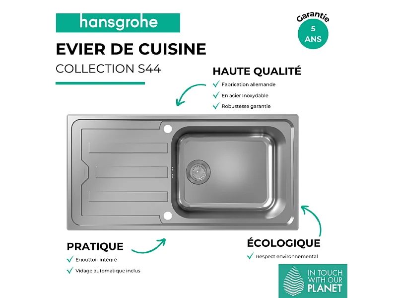Evier 1 bac avec égoutoir HANSGROHE S44 inox