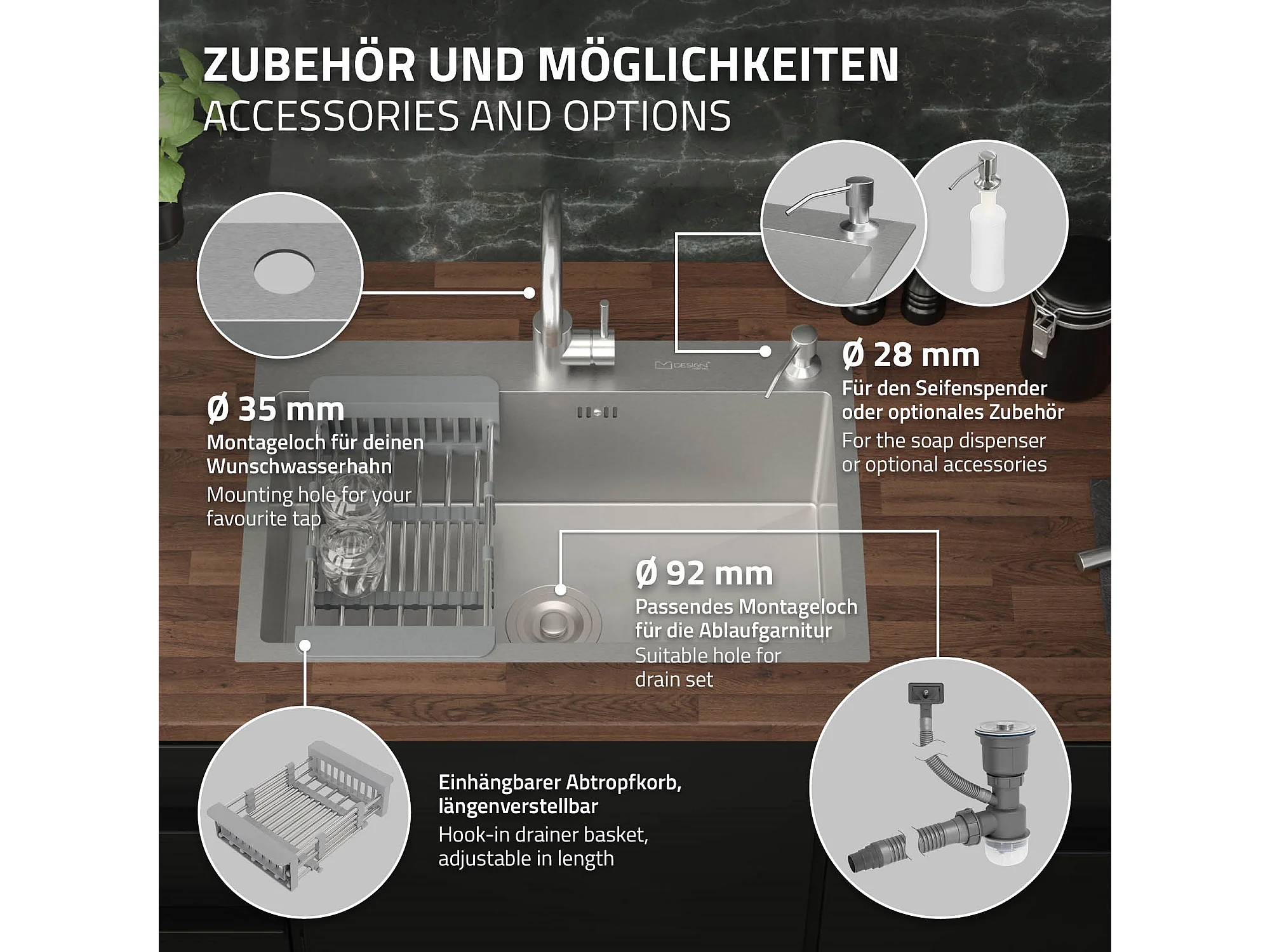 Évier de cuisine à encastrer en acier 55x45 cm avec vidage et distributeur savon