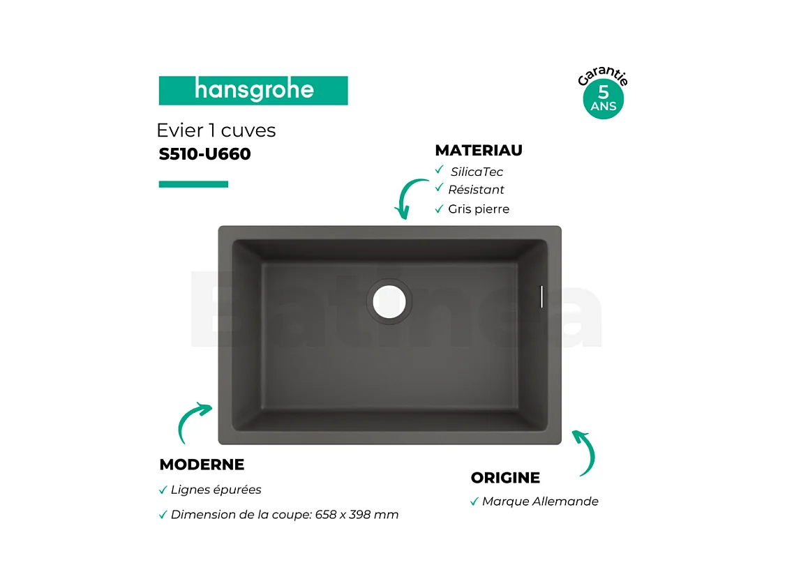 Evier à encastrer sous plan 1 bac HANSGROHE S51 660 avec vidage auto gris pierre