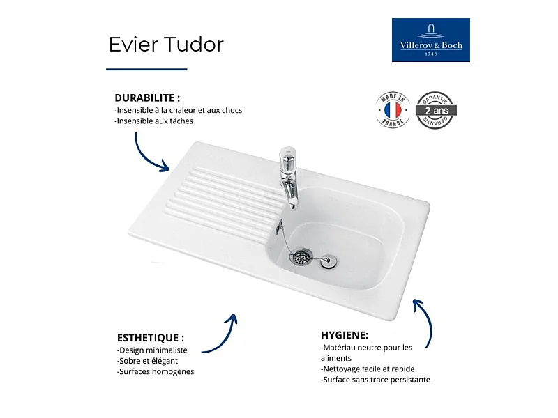 Evier avec 1 bac VILLEROY ET BOCH Tudor blanc 92 x 51 cm