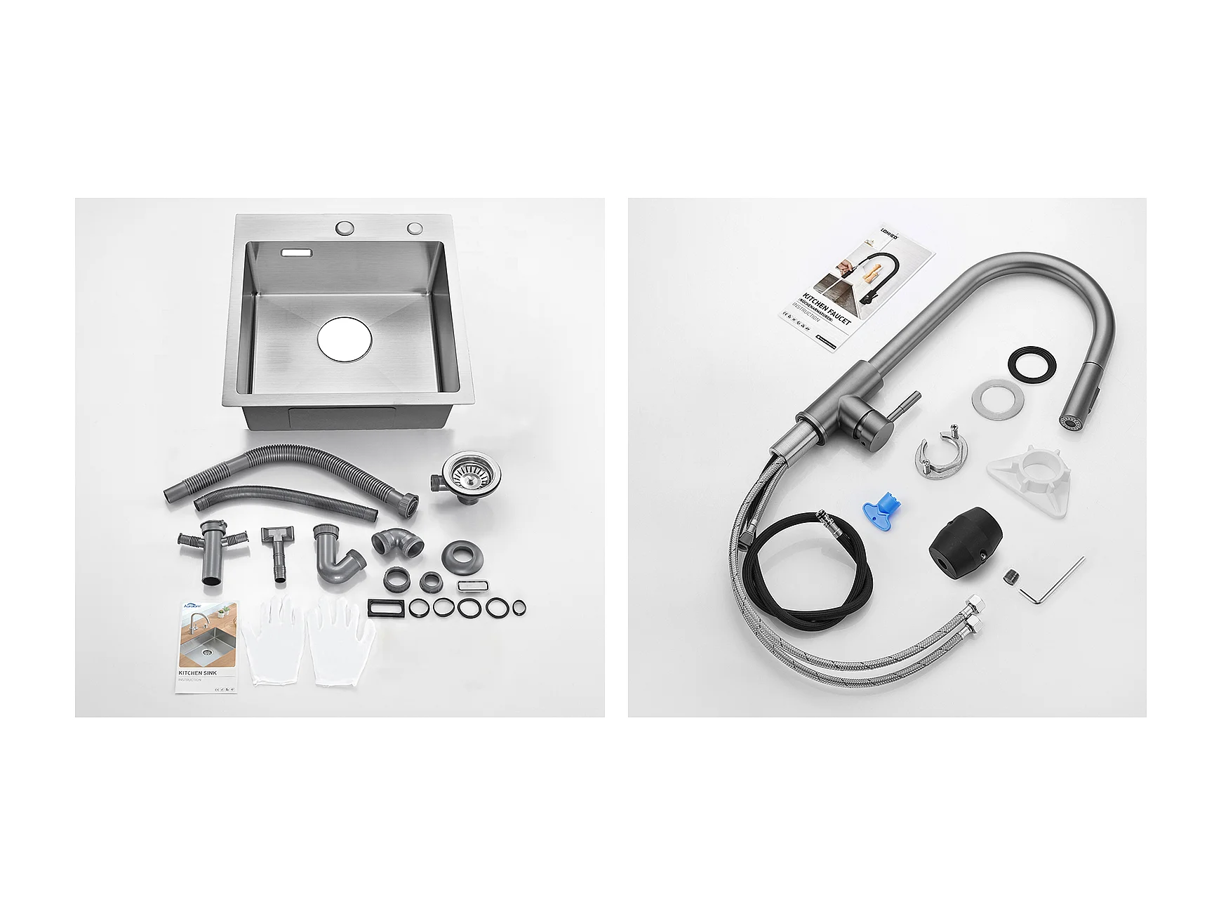 Évier Cuisine 1 Bac 45x45CM Acier Inoxydable 304 ,encastré et à Poser+Robinet Cuisine Douchette Extractible Gris Foncé Rotatif 360 °