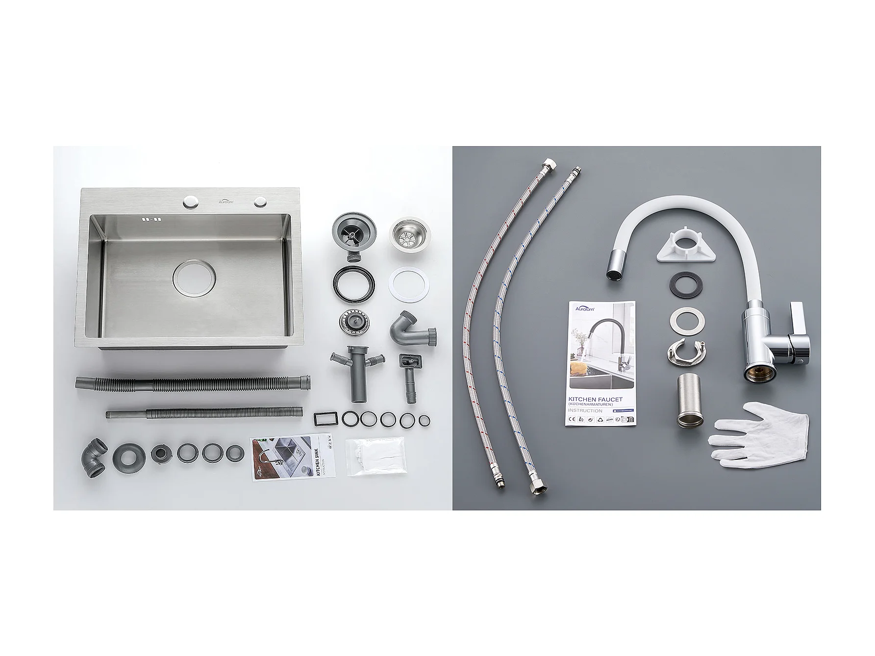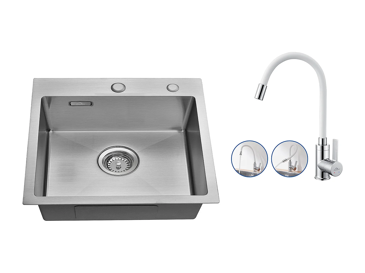 Évier Cuisine 1 Bac 45x45CM Acier Inoxydable 304,encastré et à Poser+Robinet Cuisine Flexible Bec Haut Orientable Librement,Eau Chaude/Froide,Blanc