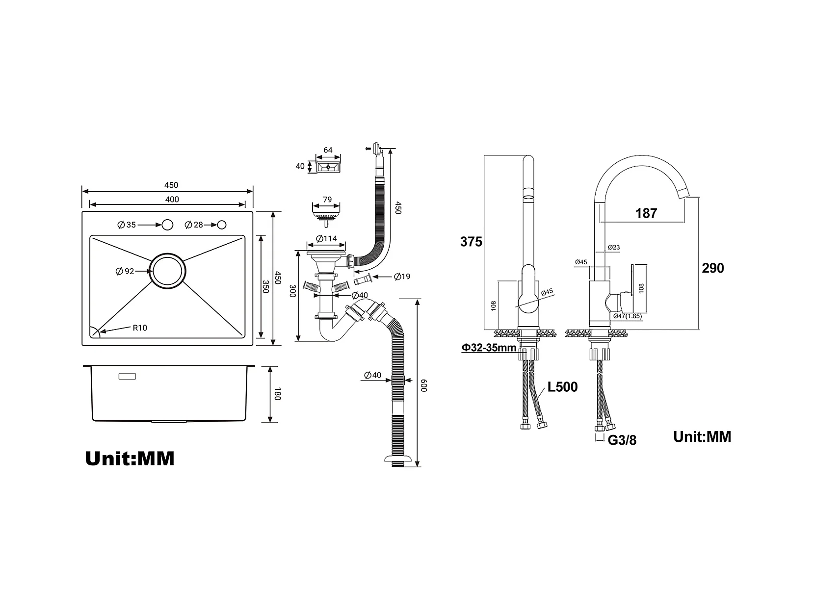 Évier de Cuisine 1 Bac 45x45CM Acier Inoxydable 304 , encastré et à Poserr+ Robinet de Cuisine Noir avec Douchette Extractible