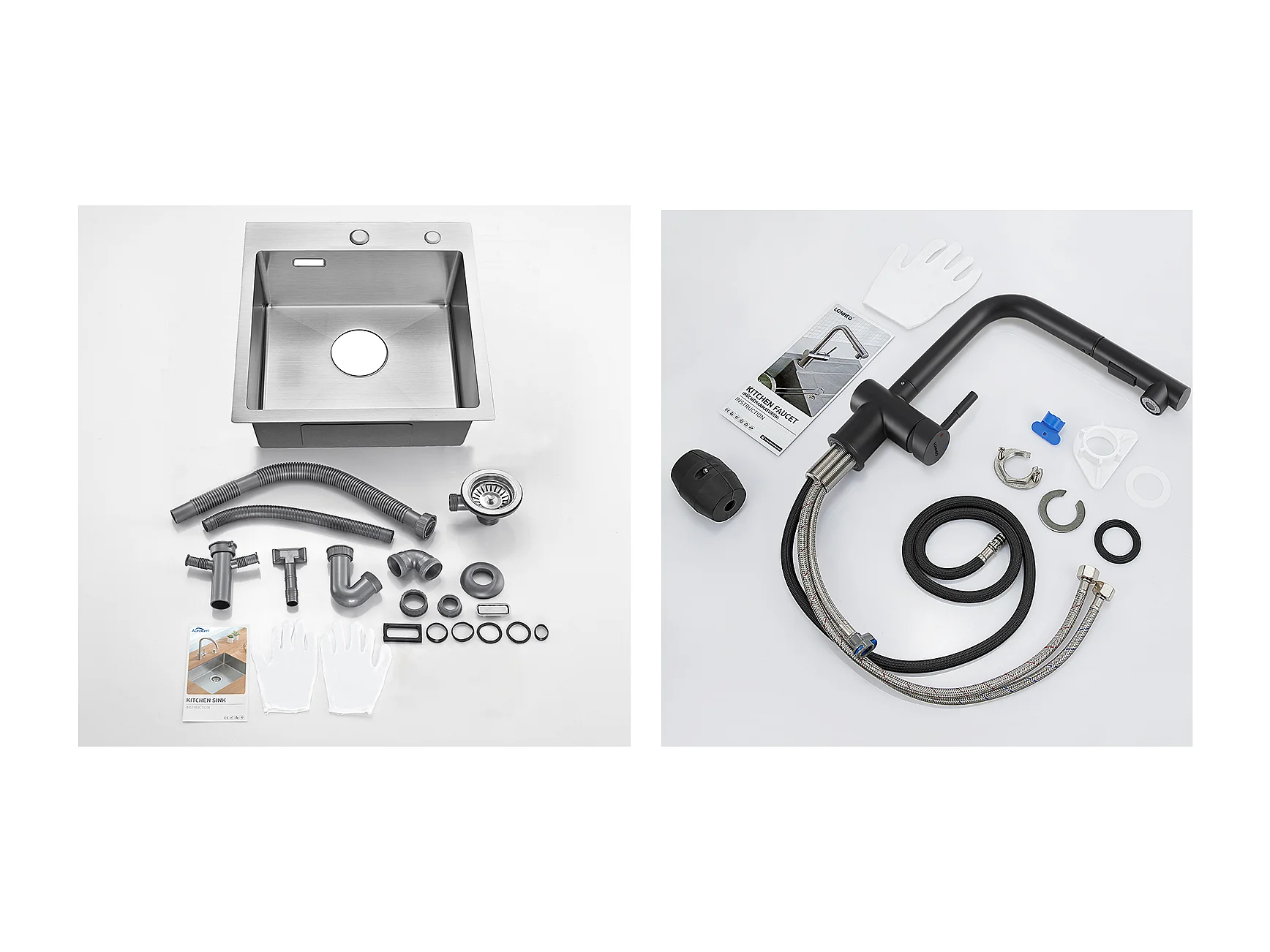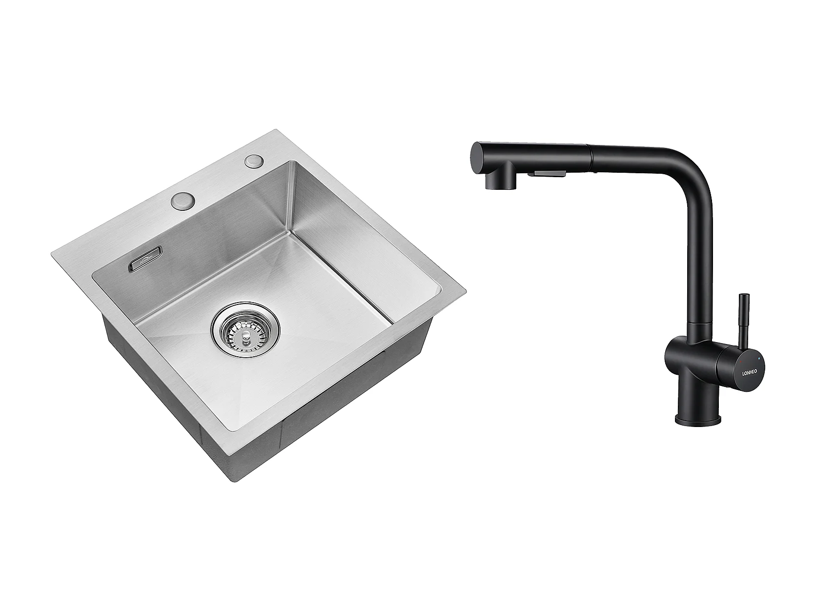 Évier Cuisine 1 Bac 45x45CM Acier Inoxydable 304 ,encastré et à Poser + Robinet de Cuisine Noir Douchette Extractible à 2 Jets