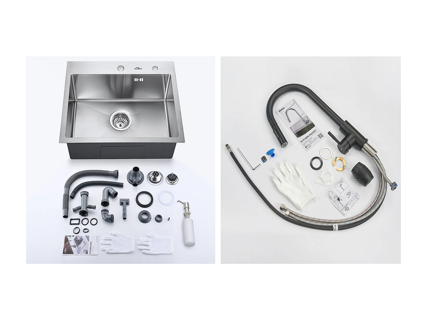 Évier Cuisine 1 Bac 55*45CM Évier Encastré et à Poser avec Distributeur de Savon+Robinet de Cuisine Noir,Extractible Rotatif à 360 °, 2 Foncti