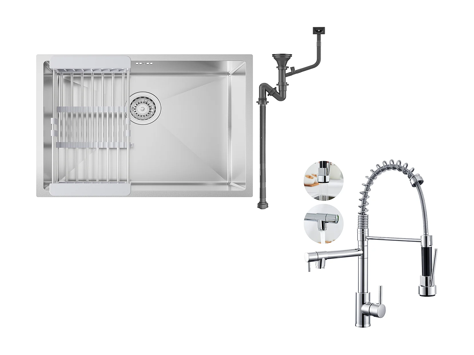 Évier Cuisine 1 Bac 60*44*20CM,inox 304,à Encastrer/sous-plan avec Panier Drainage,Nano Silver+Robinet Cuisine Rotatif 360° Douchette Extractible