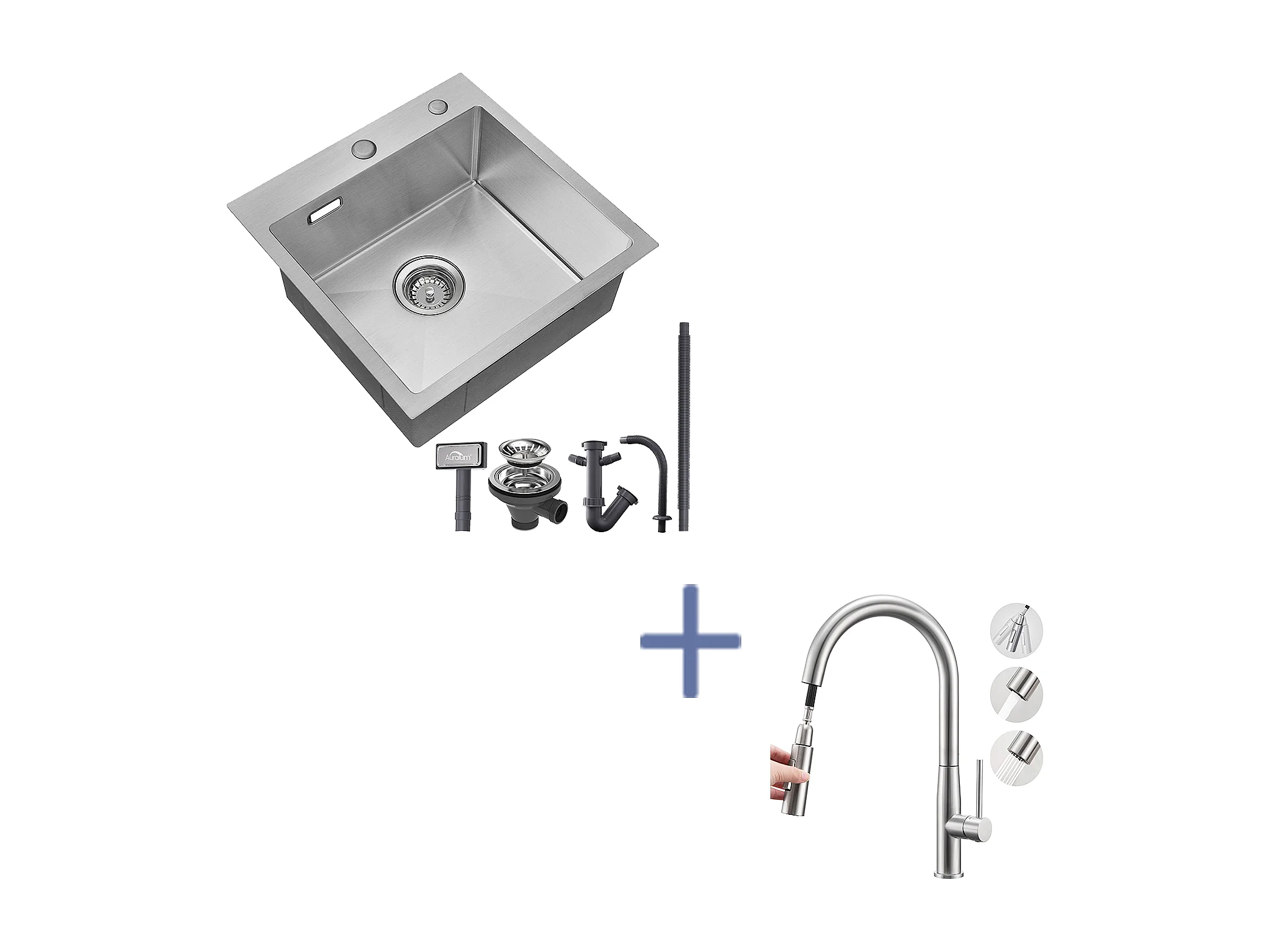 Évier Cuisine 1Bac 45x45CM Acier Inoxydable 304 ,encastré/à Poser+Mitigeur Cuisine,avec Douchette Extractible,2 Modes,Eau Froide/Chaude,Brossé