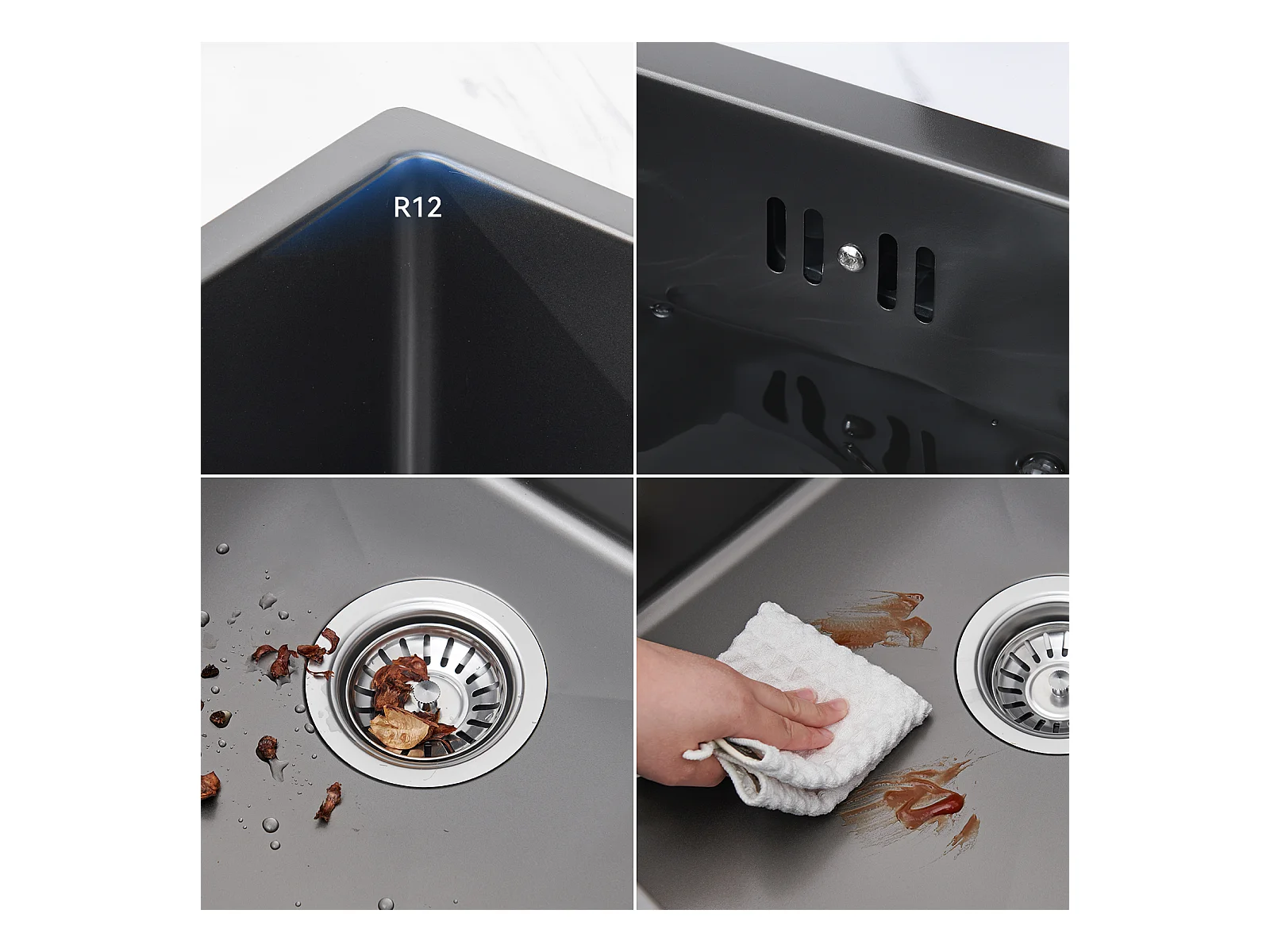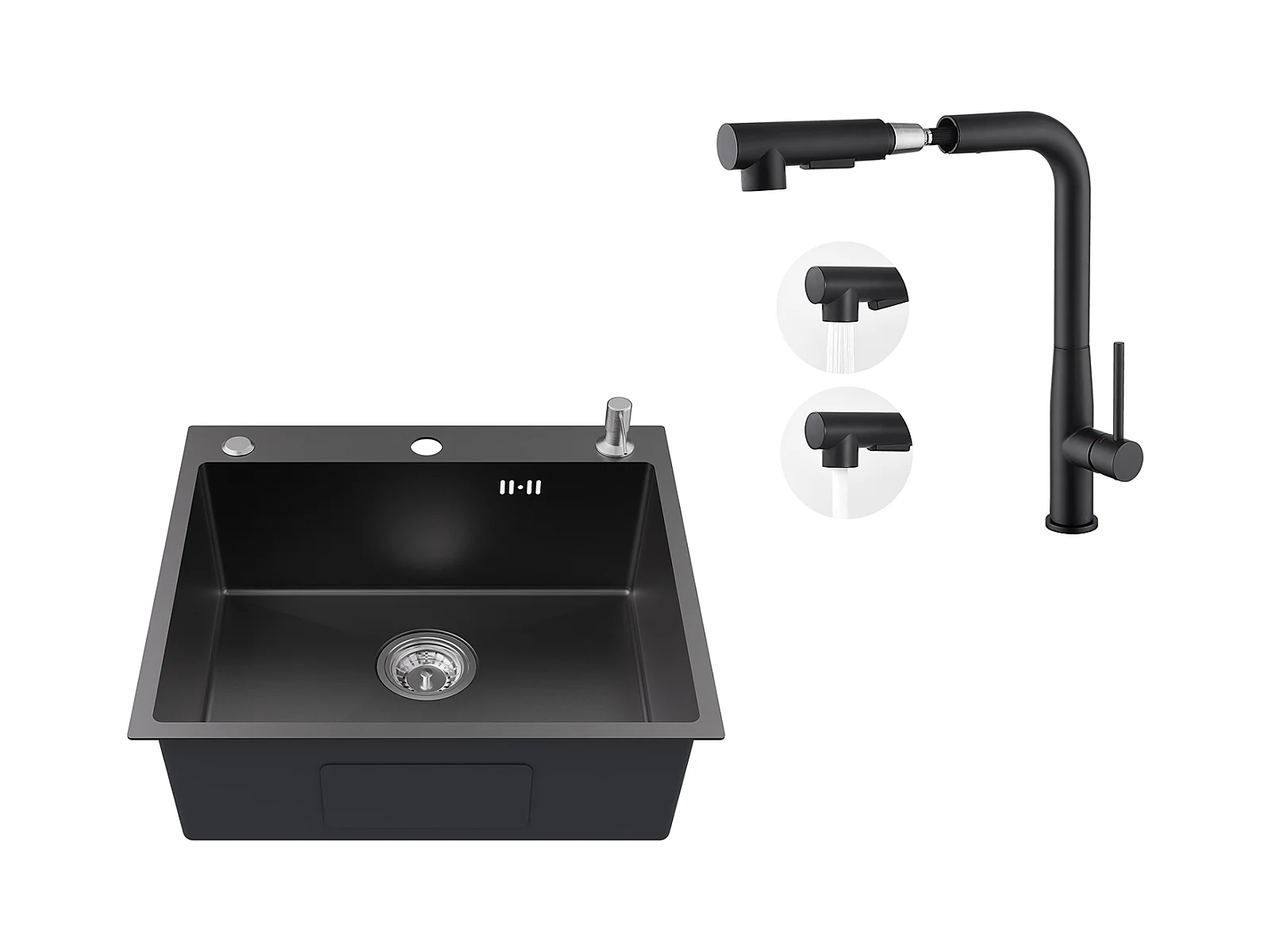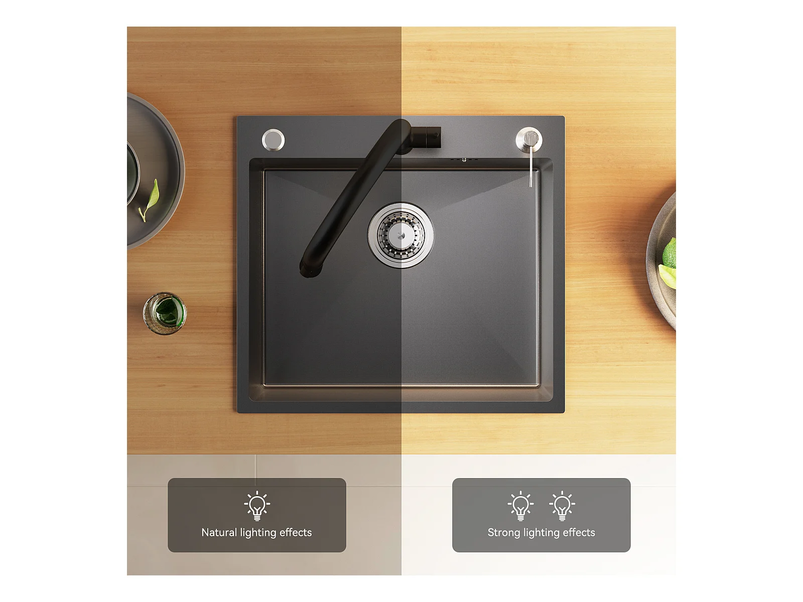 Evier Cuisine 1Bac 54*49*20 CM,Inox,Noir Gris,Evier avec Distributeur Savon+Robinet Cuisine avec Douchette Extractible,Rotatif 360°,Noir