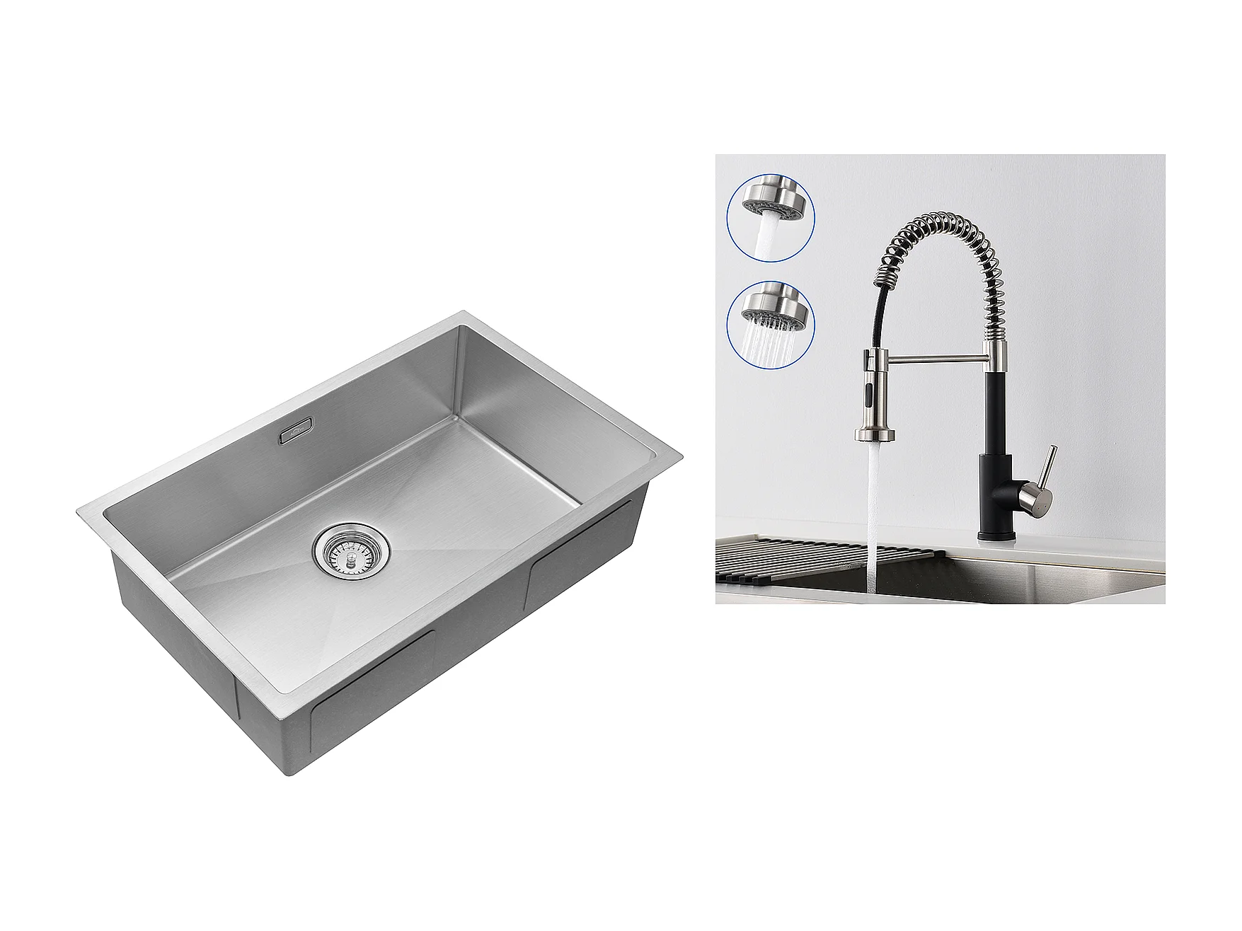 Évier Cuisine 1Bac 70*44*19CM,à Encastrer/Fleur/Sous-Plan,avec Siphon/Trop-Plein,Brossé+Robinet Cuisine Ressort avec Douchette Extensible,2 Modes,Noir