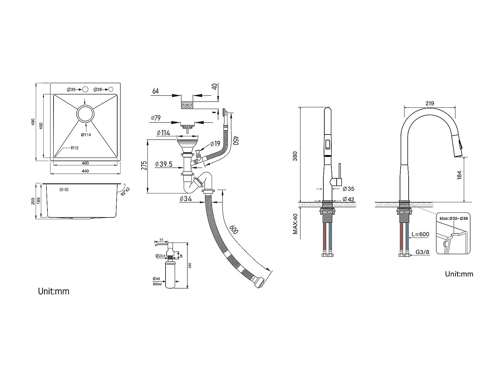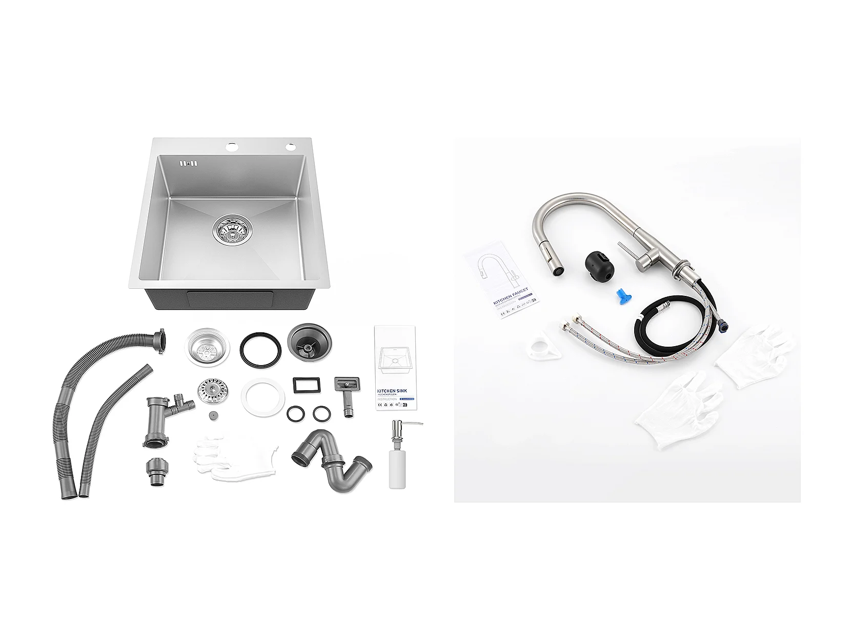 Évier Cuisine 1Bac Argent,44*49*20 CM,avec Distributeur Savon,Inox+Robinet Cuisine avec Douchette Extractible,2 Modes Jets ,Brossé