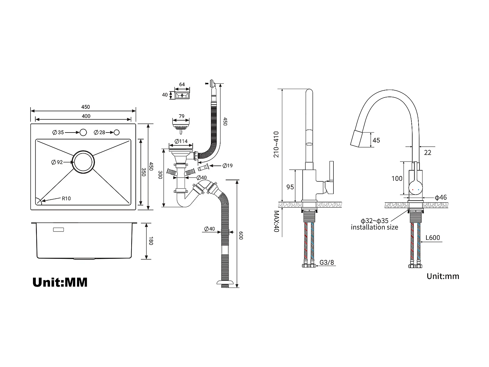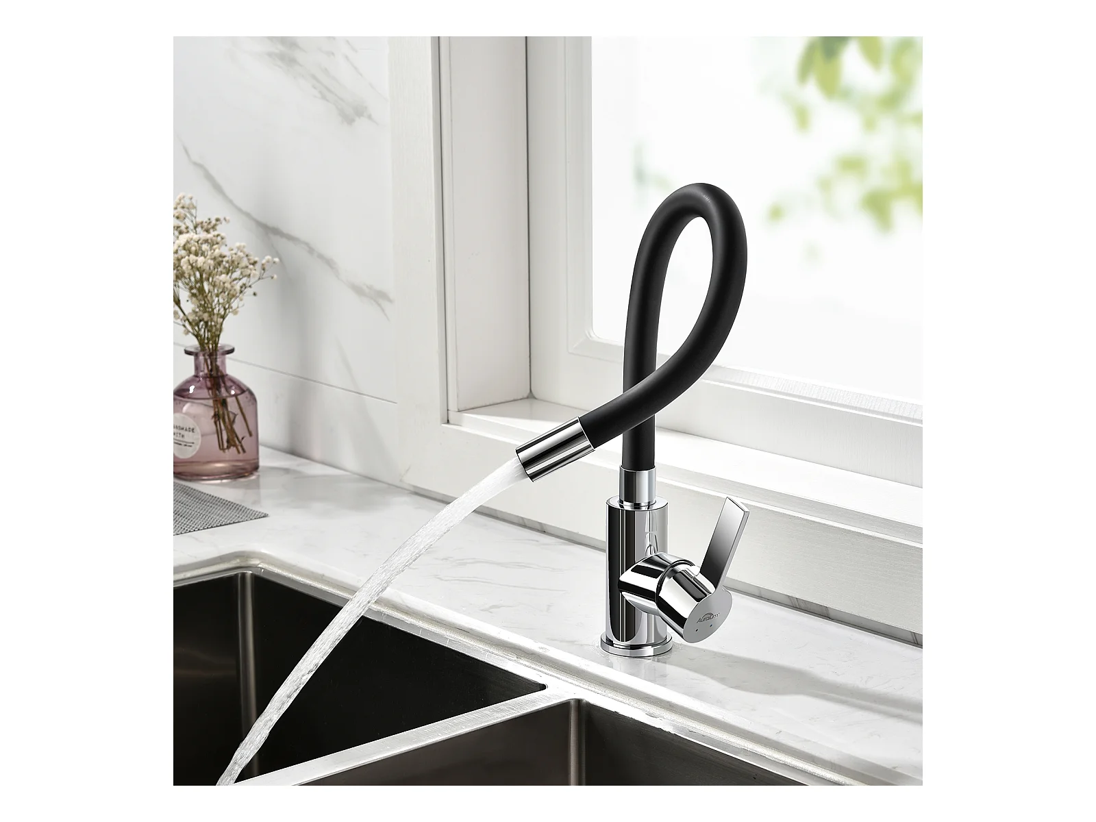 Évier Cuisine Noir  1 Bac 45x45CM Acier Inoxydable 304 ,encastré et à Poser+Robinet de Cuisine Flexible Bec Haut Orientable