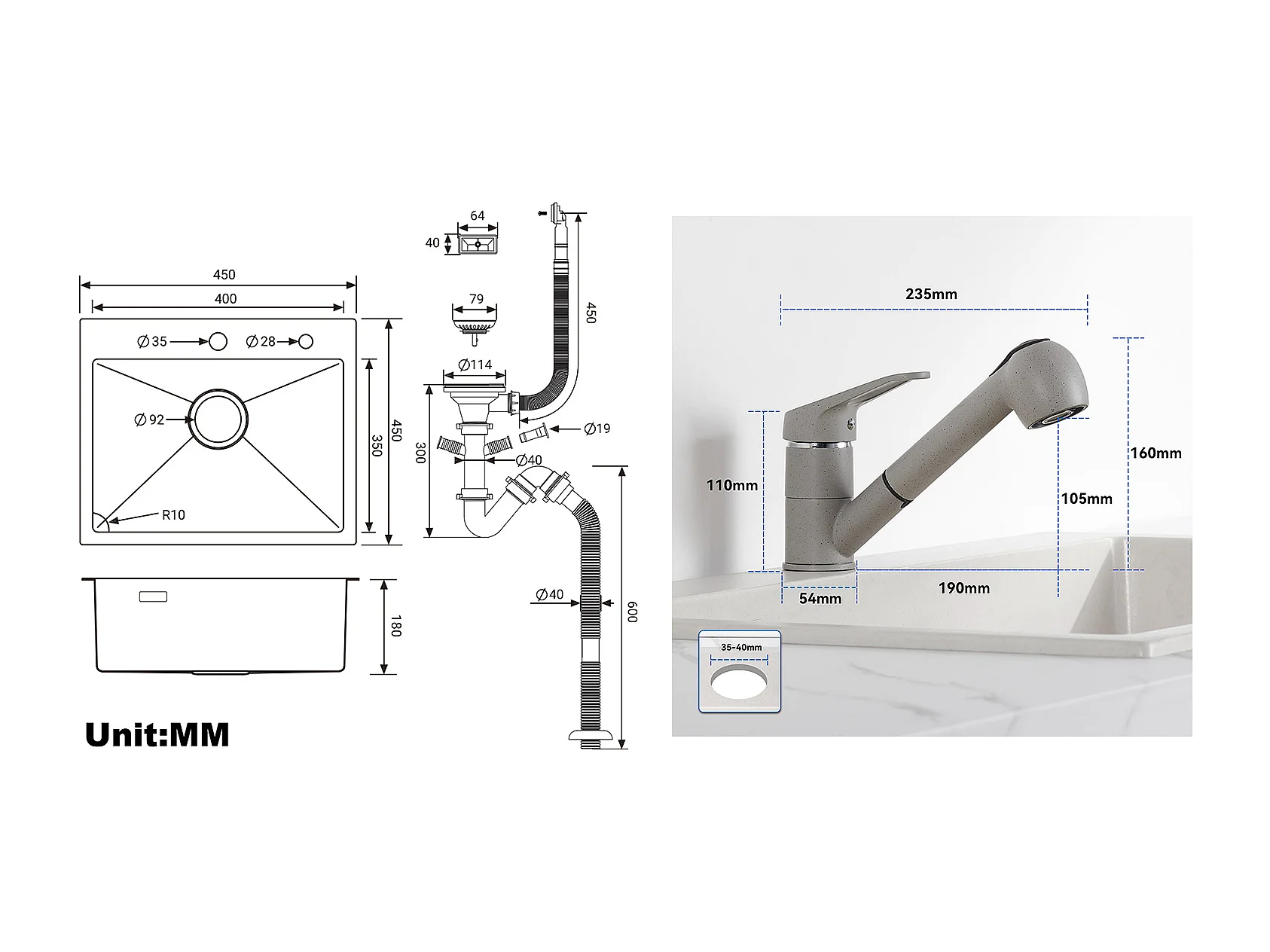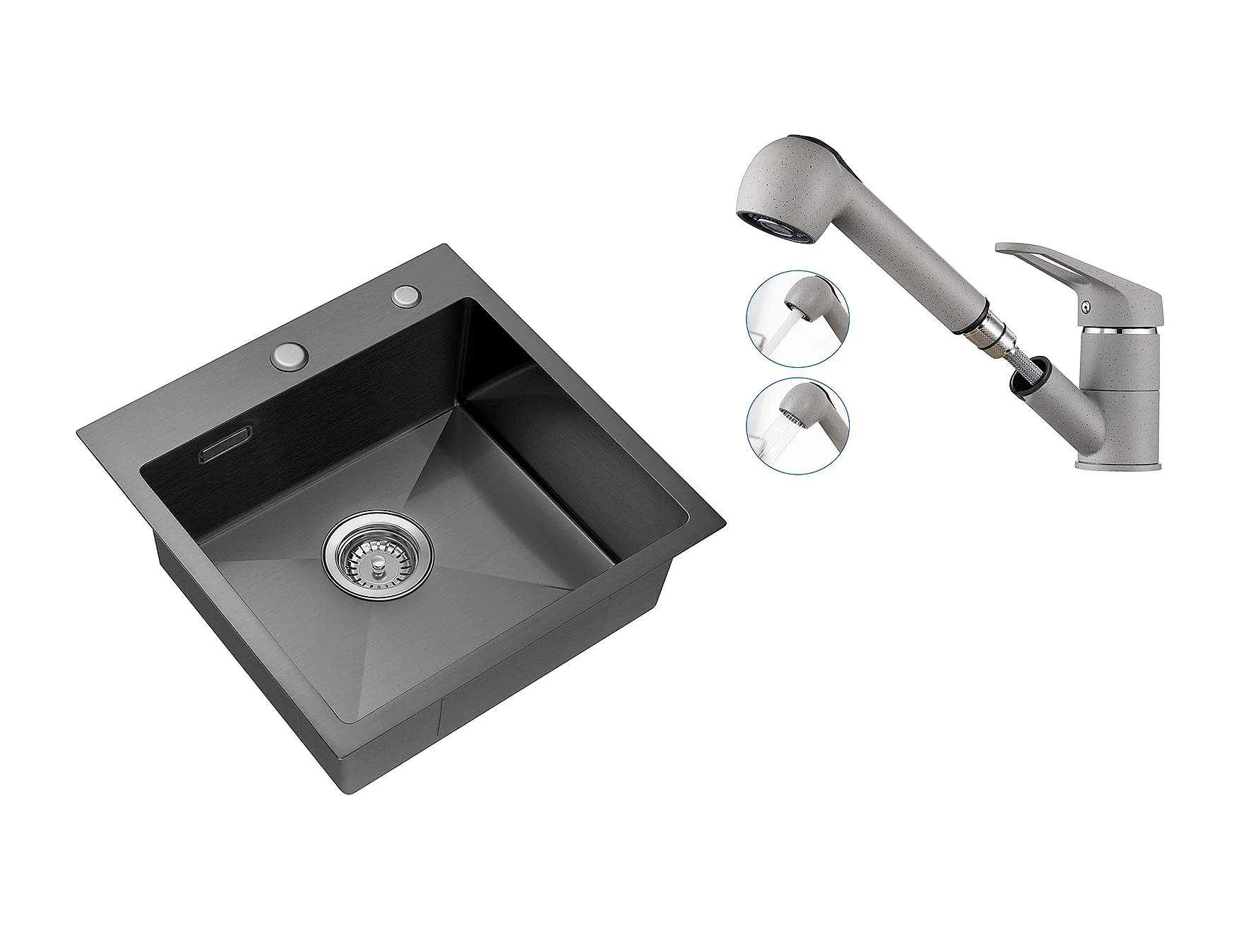 Évier Cuisine Noir1Bac 45x45CM Acier Inoxydable ,encastré et à Poser+Robinet Cuisine avec Douchette Extractible 2 Jets,Eau Froide et Chaude,Gris