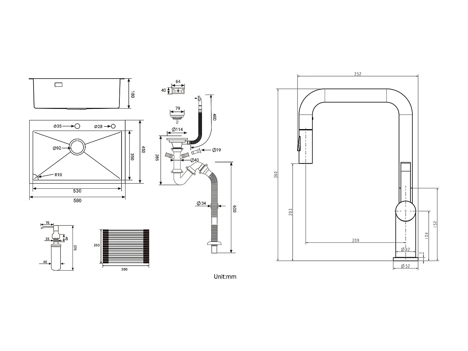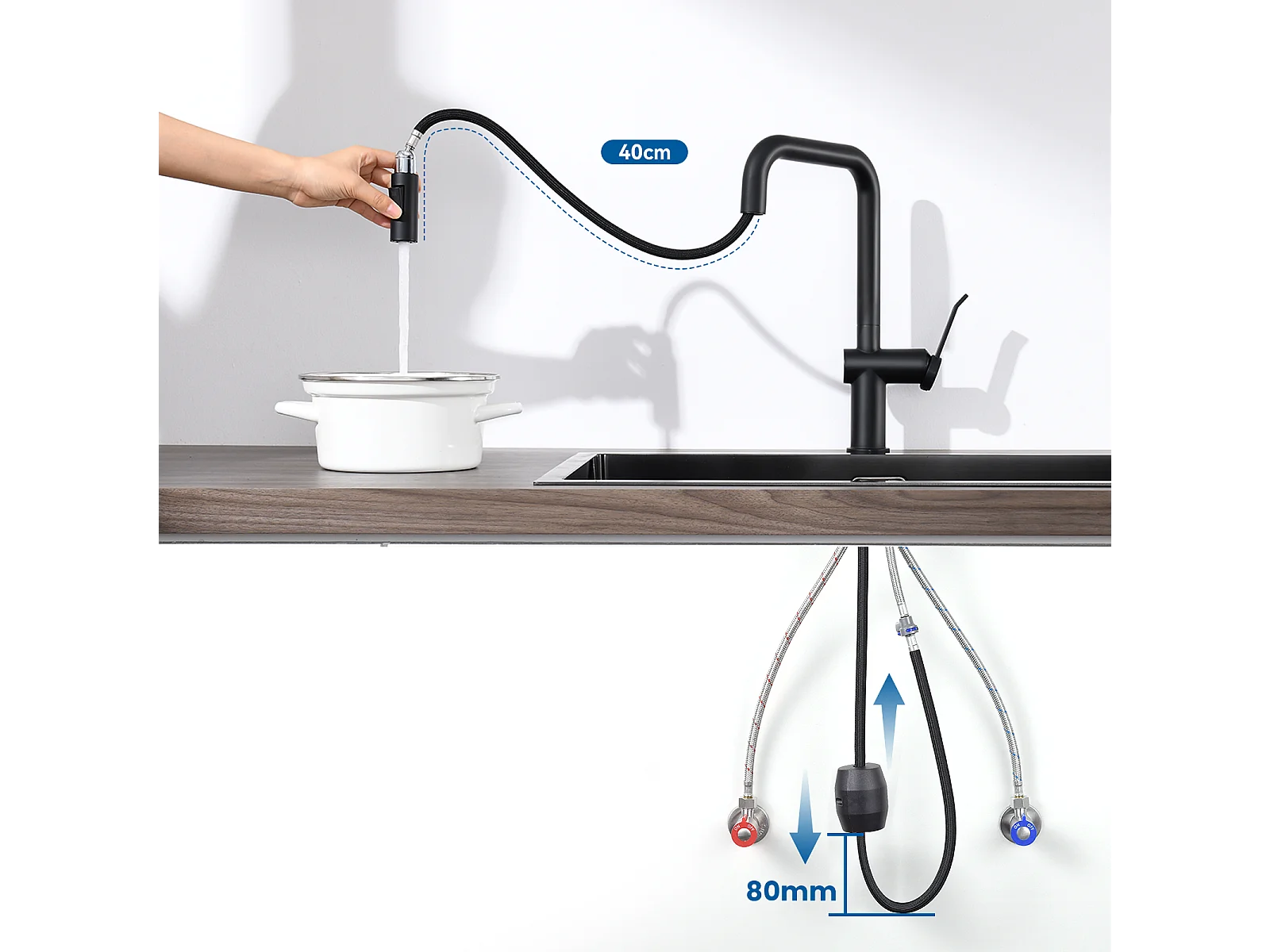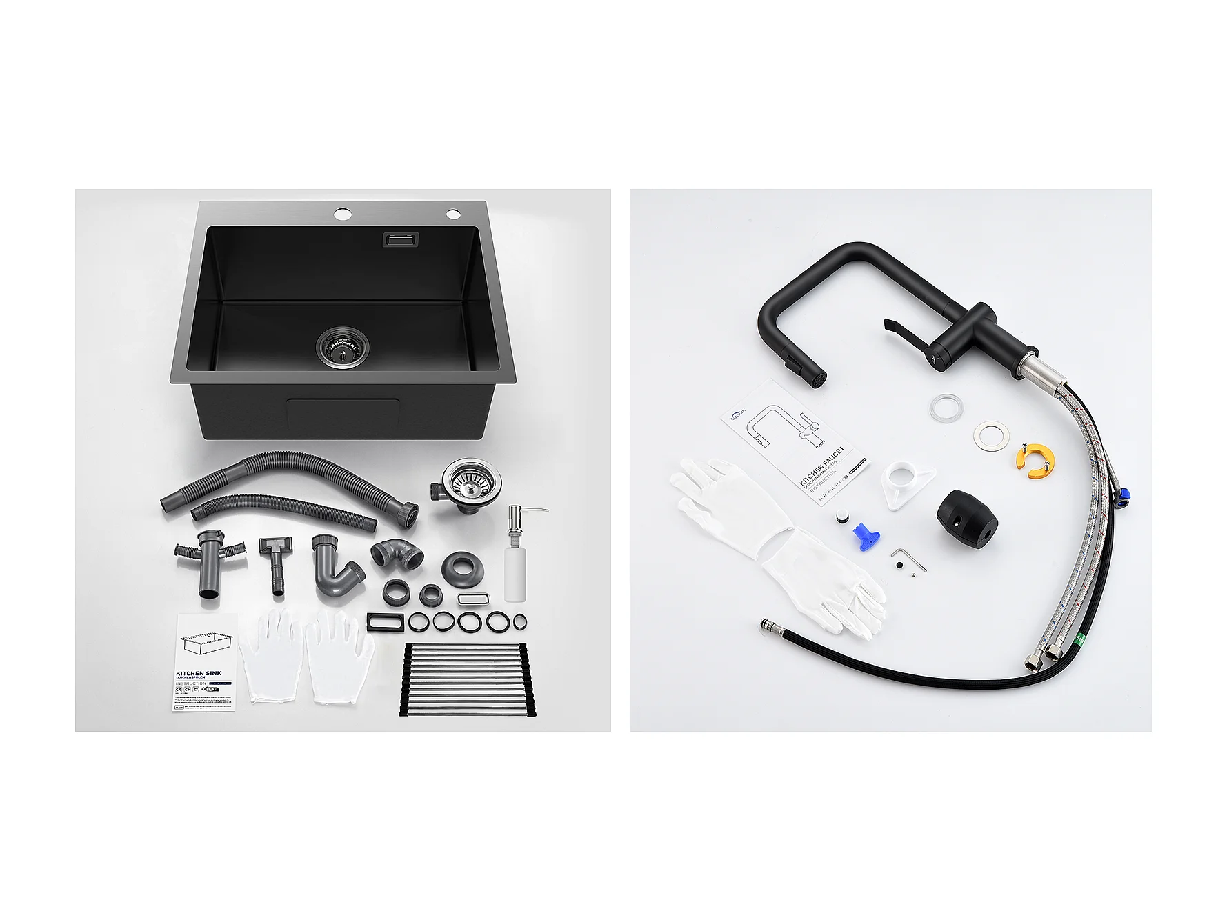 Évier Cuisine1Bac 58*45*18CM,avec Egouttoir évier Enroulable/Distributeur Savon +Robinet Cuisine avec Douchette Extractible 2 Fonctions,Noir