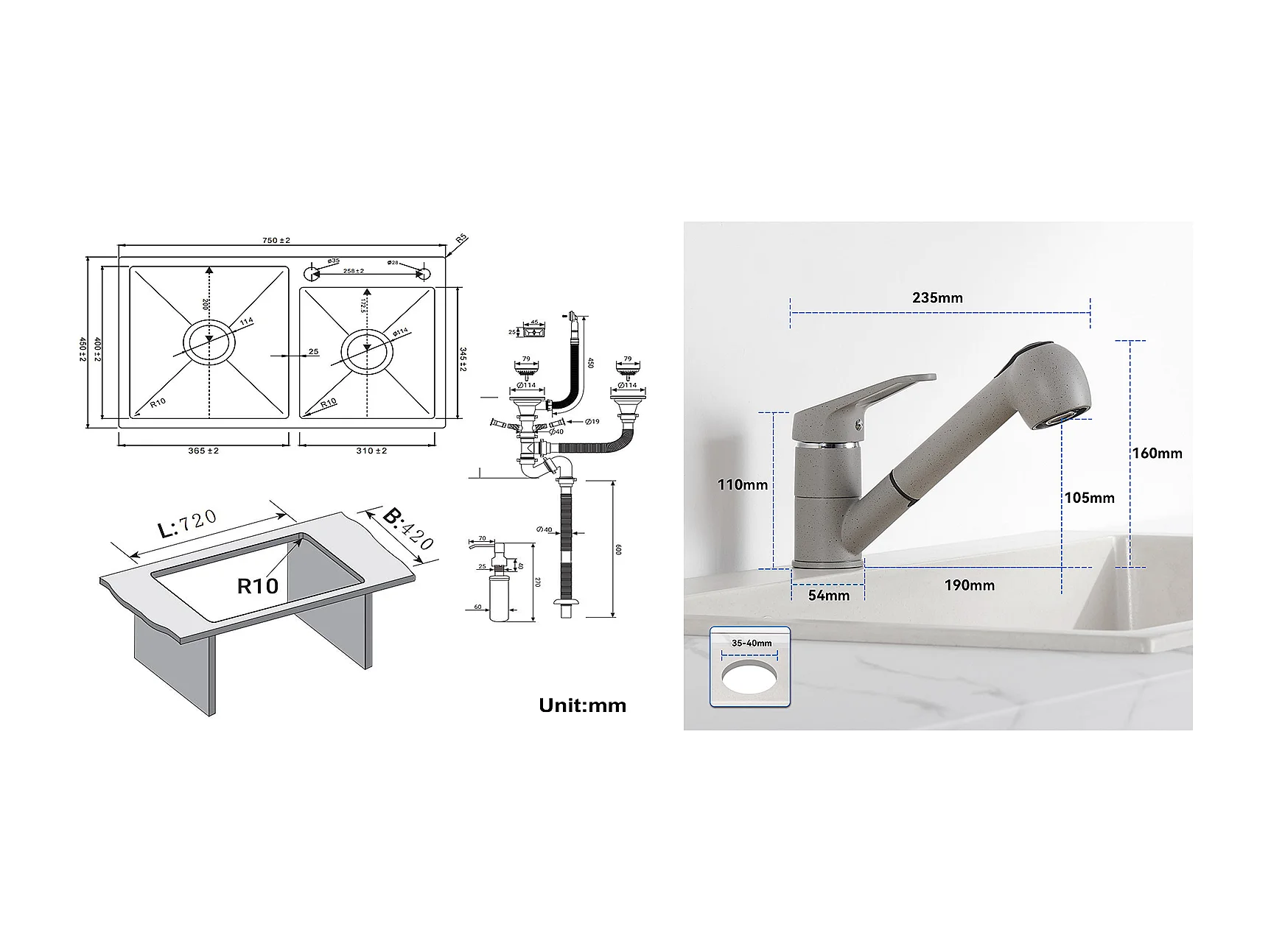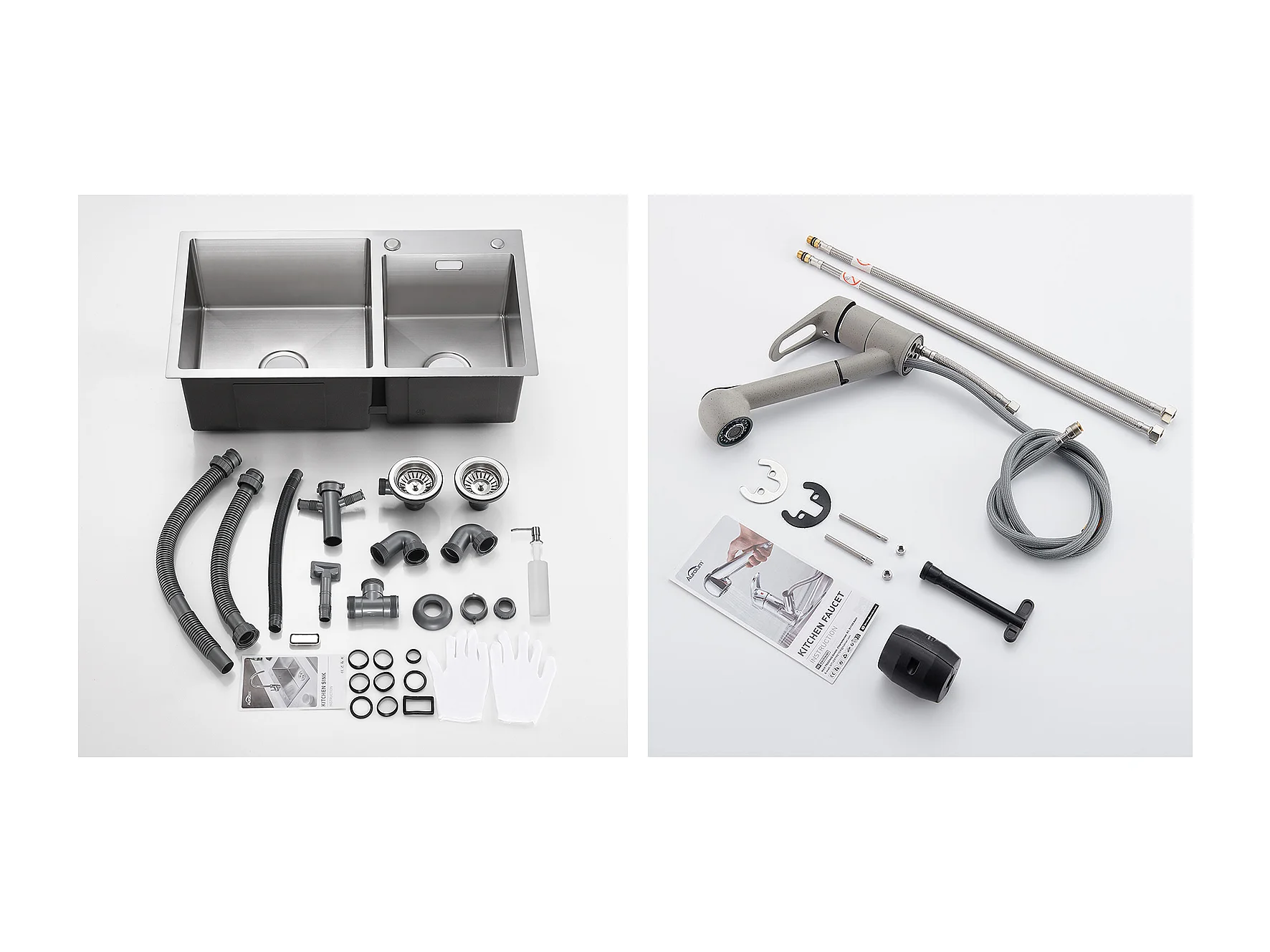Évier Cuisine2 Bac75x45x19cm,Encastré/à Poser avec Distributeur Savon+Robinet Cuisine avec Douchette Extractible 2 Jets,Eau Froide/Chaude,Gris