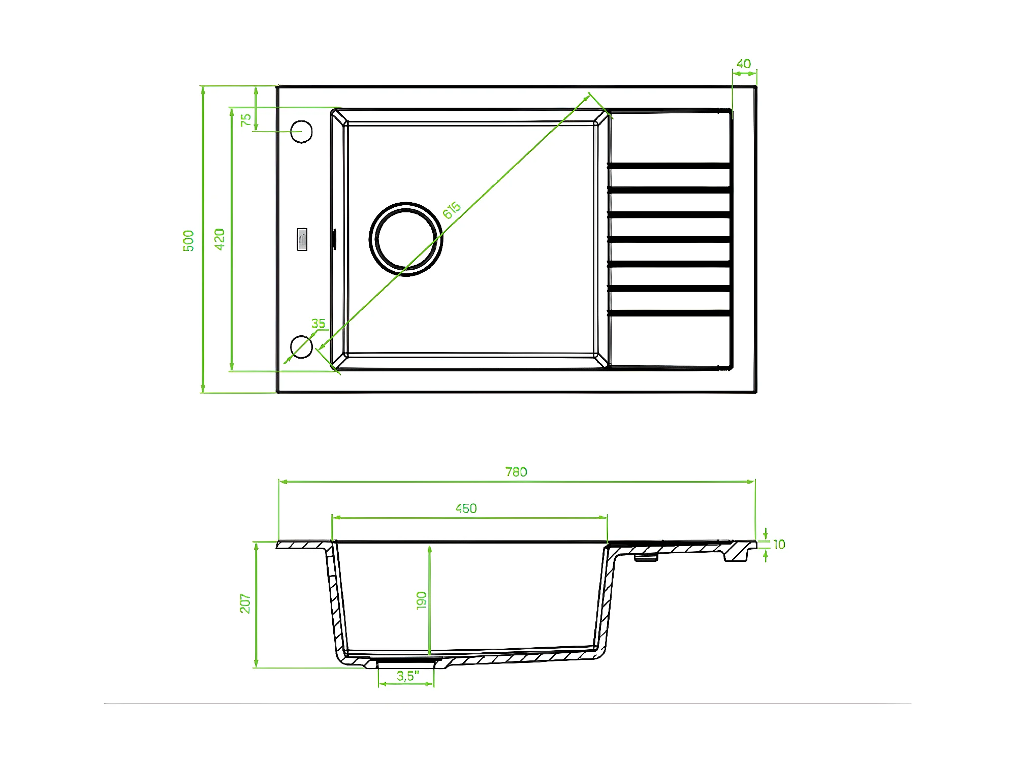 Evier de cuisine rond en granit noir PIONIER, 1 bac avec égouttoir,50x78