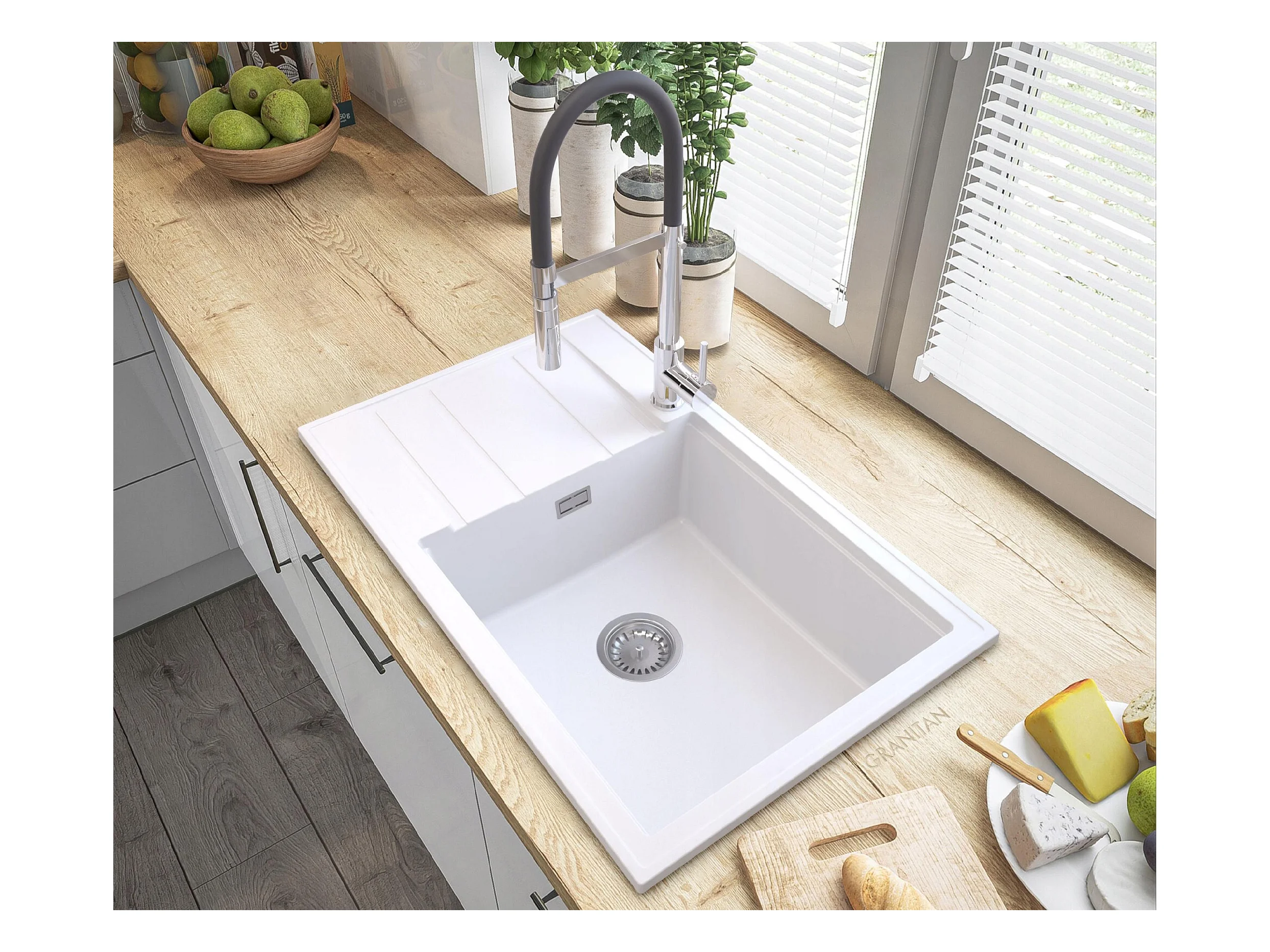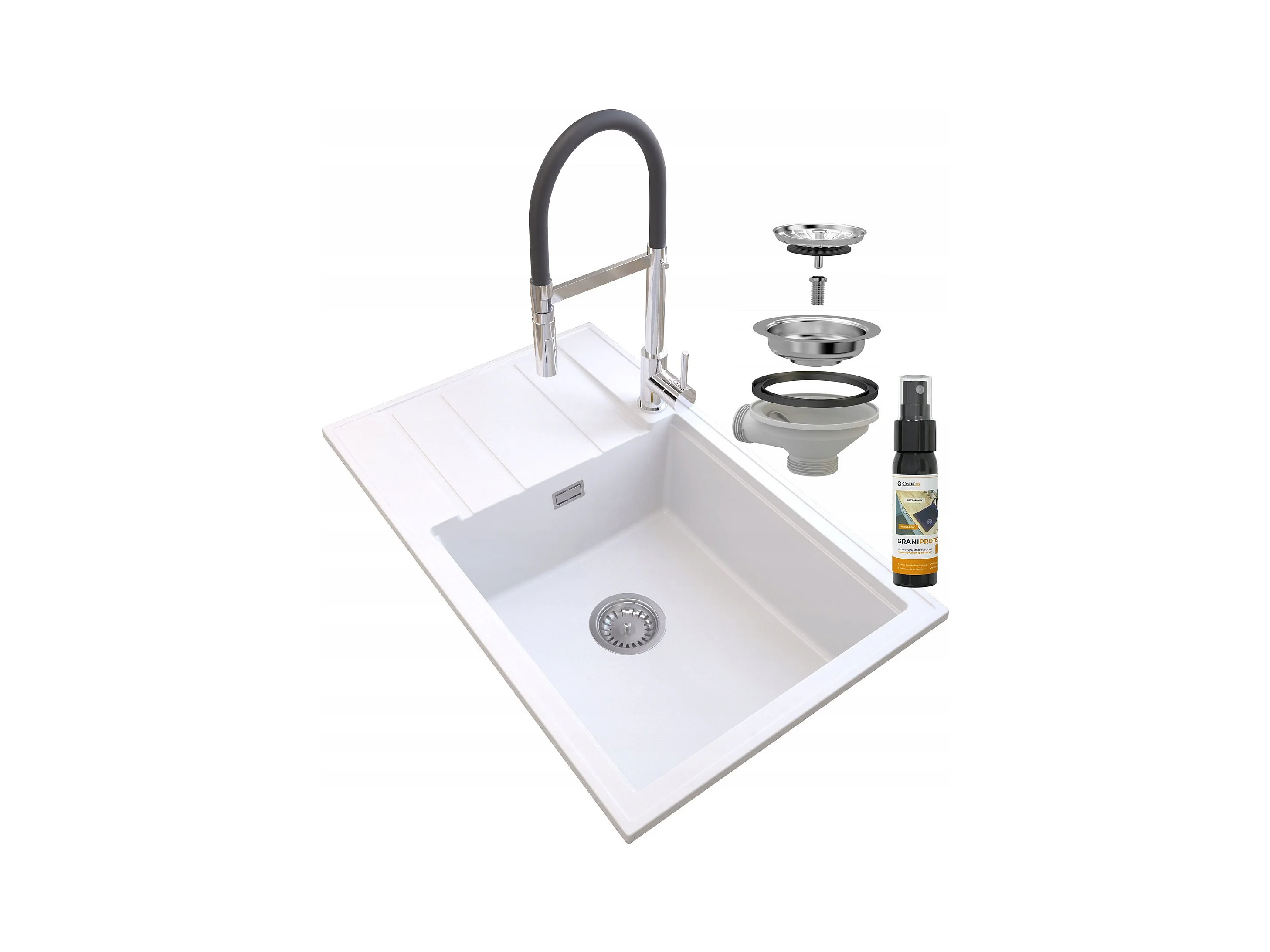 ÉVIER EN GRANIT BLANC ROBINET SIPHON LOUIS CHROMÉ
