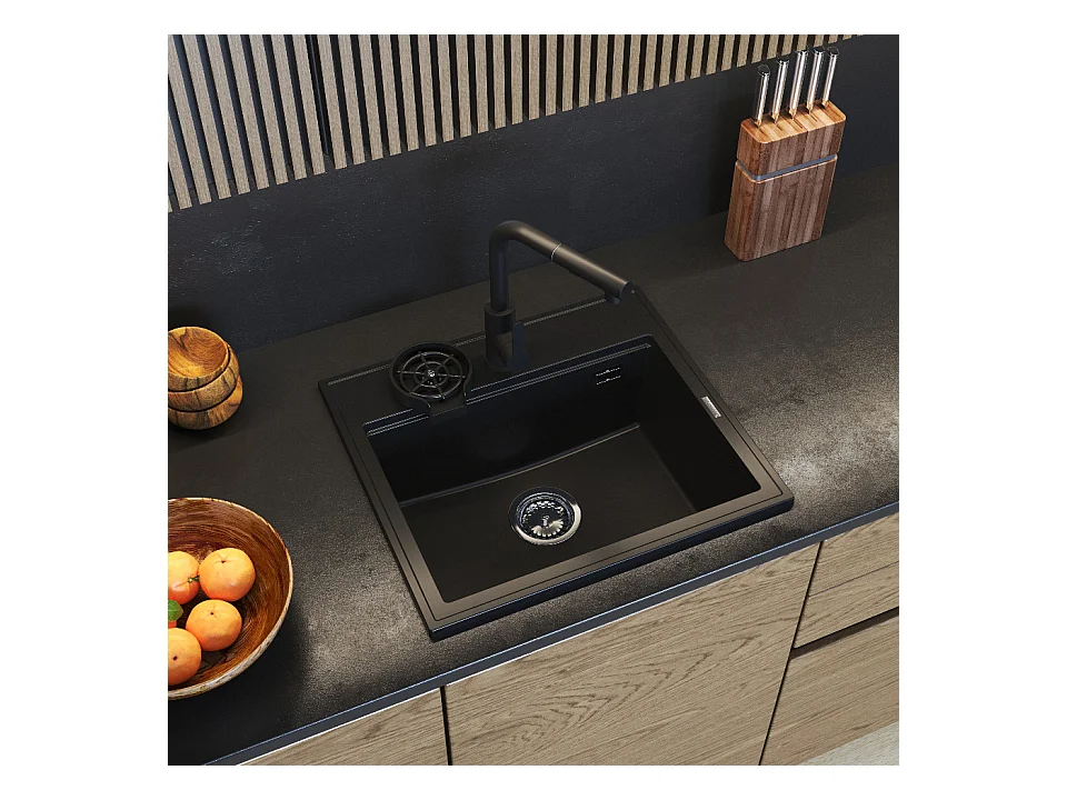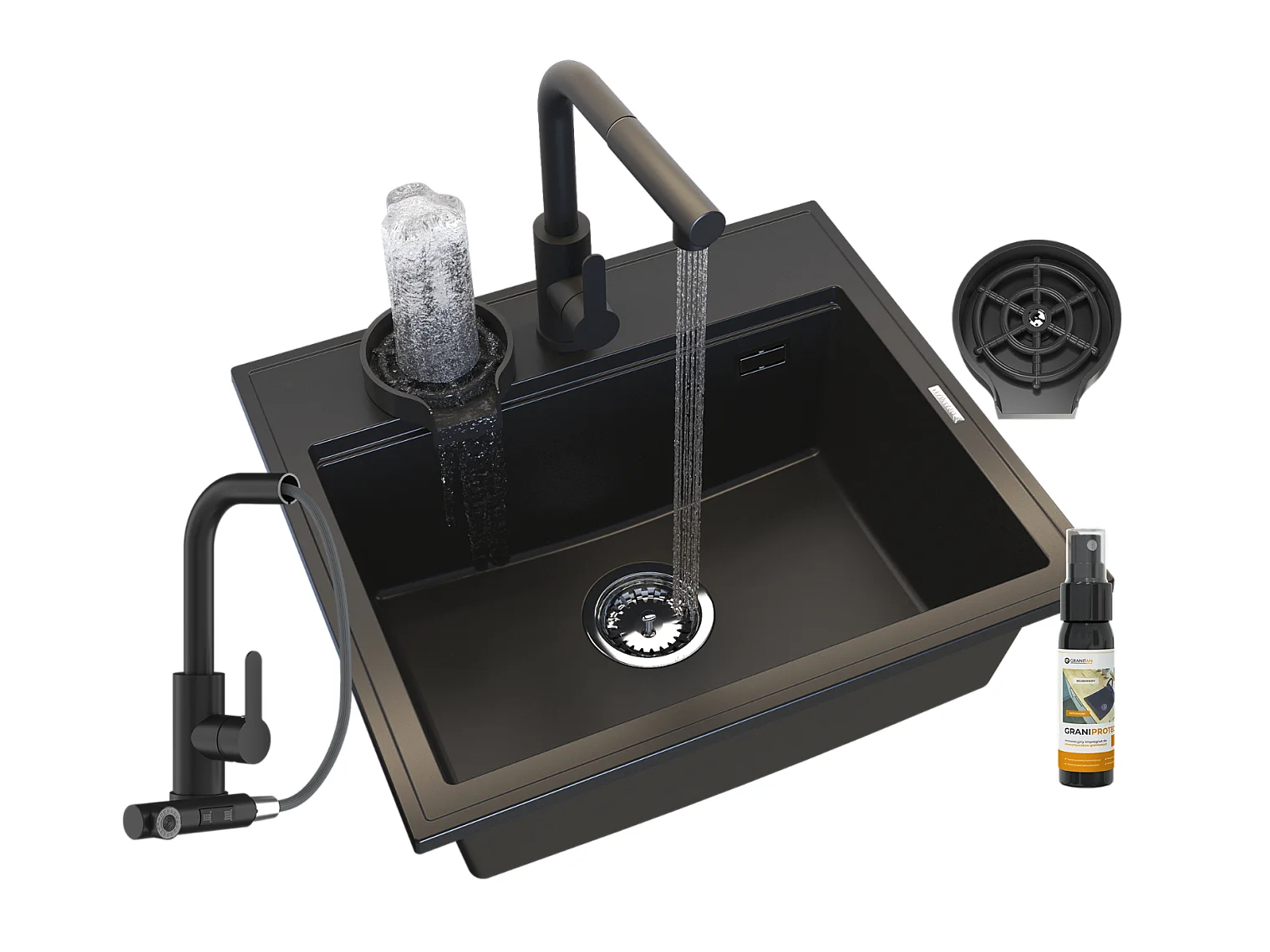 ÉVIER EN GRANIT NOIR À UNE CUVE ROBINETTERIE DE CUISINE LAVEUSE DE SIPHON SET FOXAL