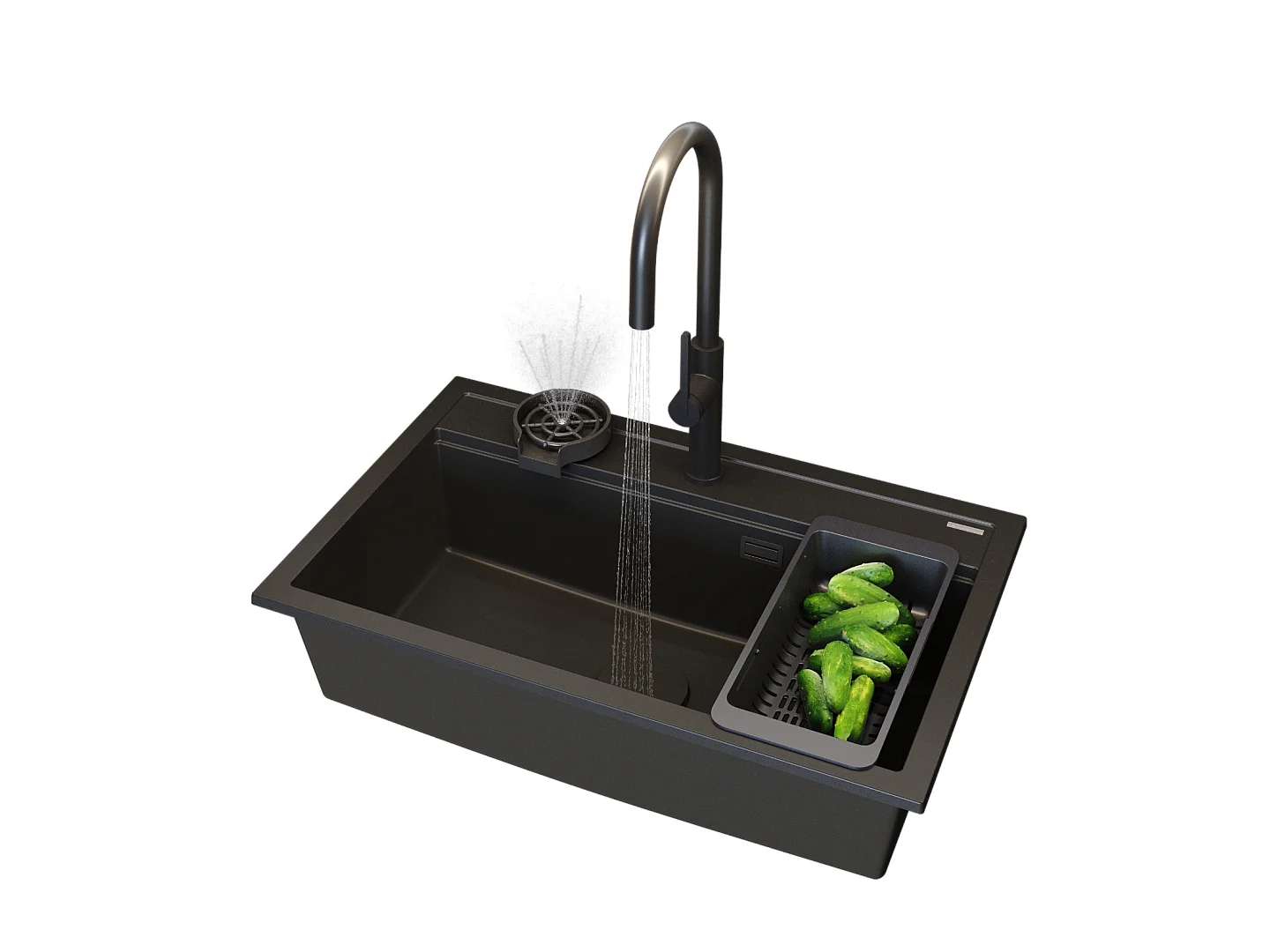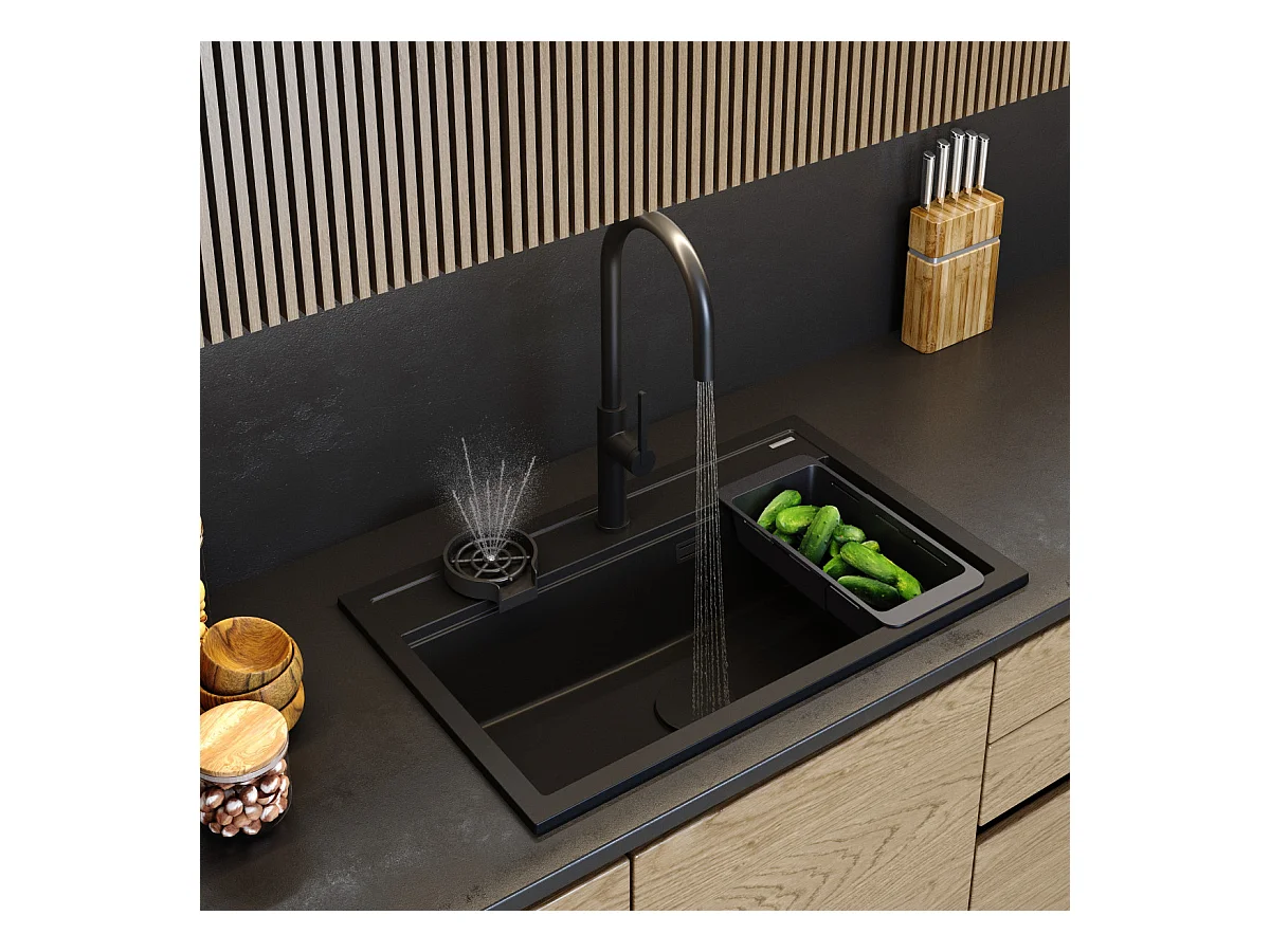 ÉVIER EN GRANIT NOIR GRAND ROBINET ÉGOUTTOIR LAVE-LINGE CAPOT SET ASTI