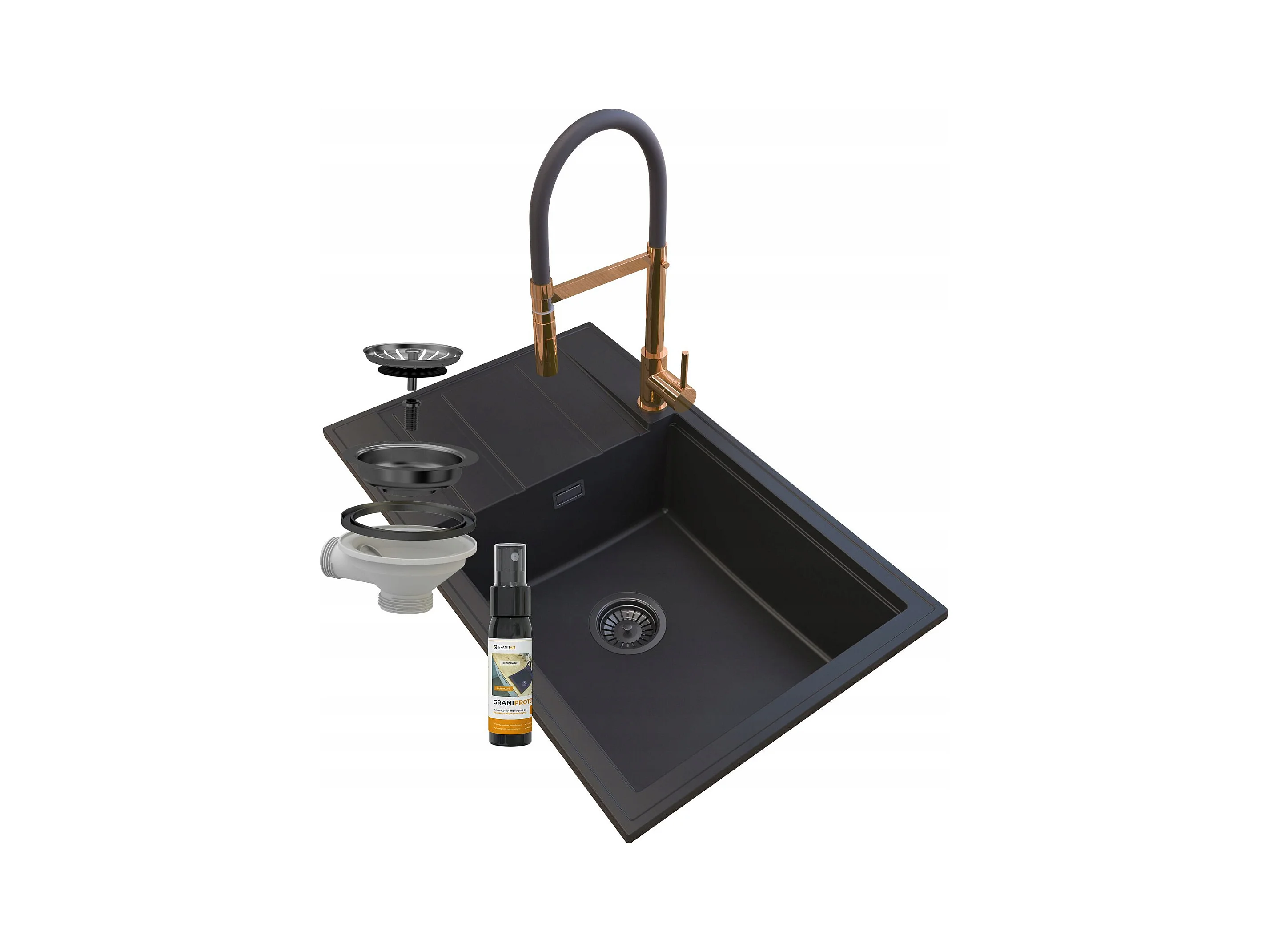 ÉVIER EN GRANIT NOIR ROBINET SIPHON LOUIS ROSEGOLD
