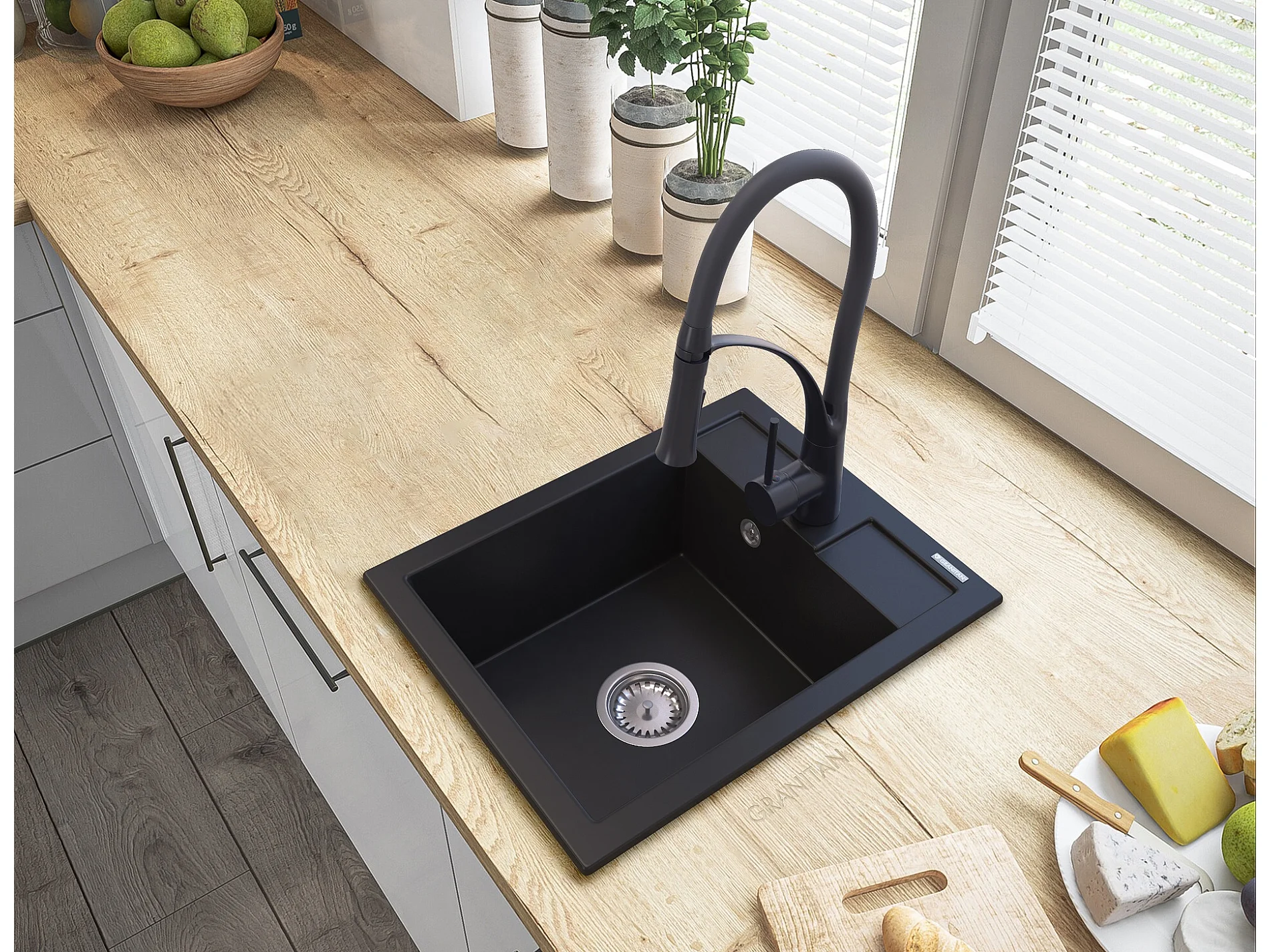 ÉVIER EN GRANIT + ROBINET NOIR + SIPHON NOIR