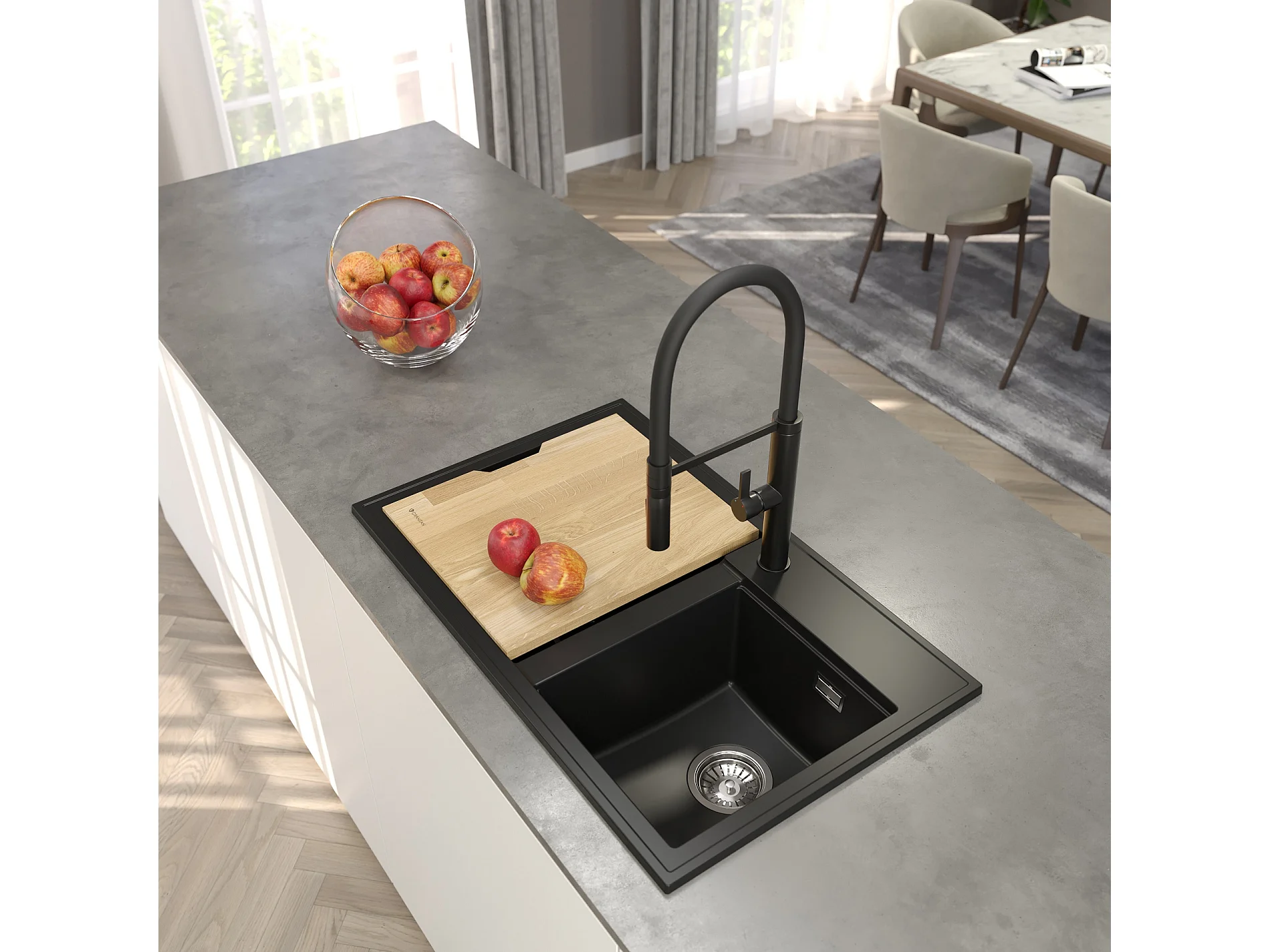ÉVIER EN GRANIT ROBINET HECTOR NOIR SIPHON CHROMÉ COMPLET
