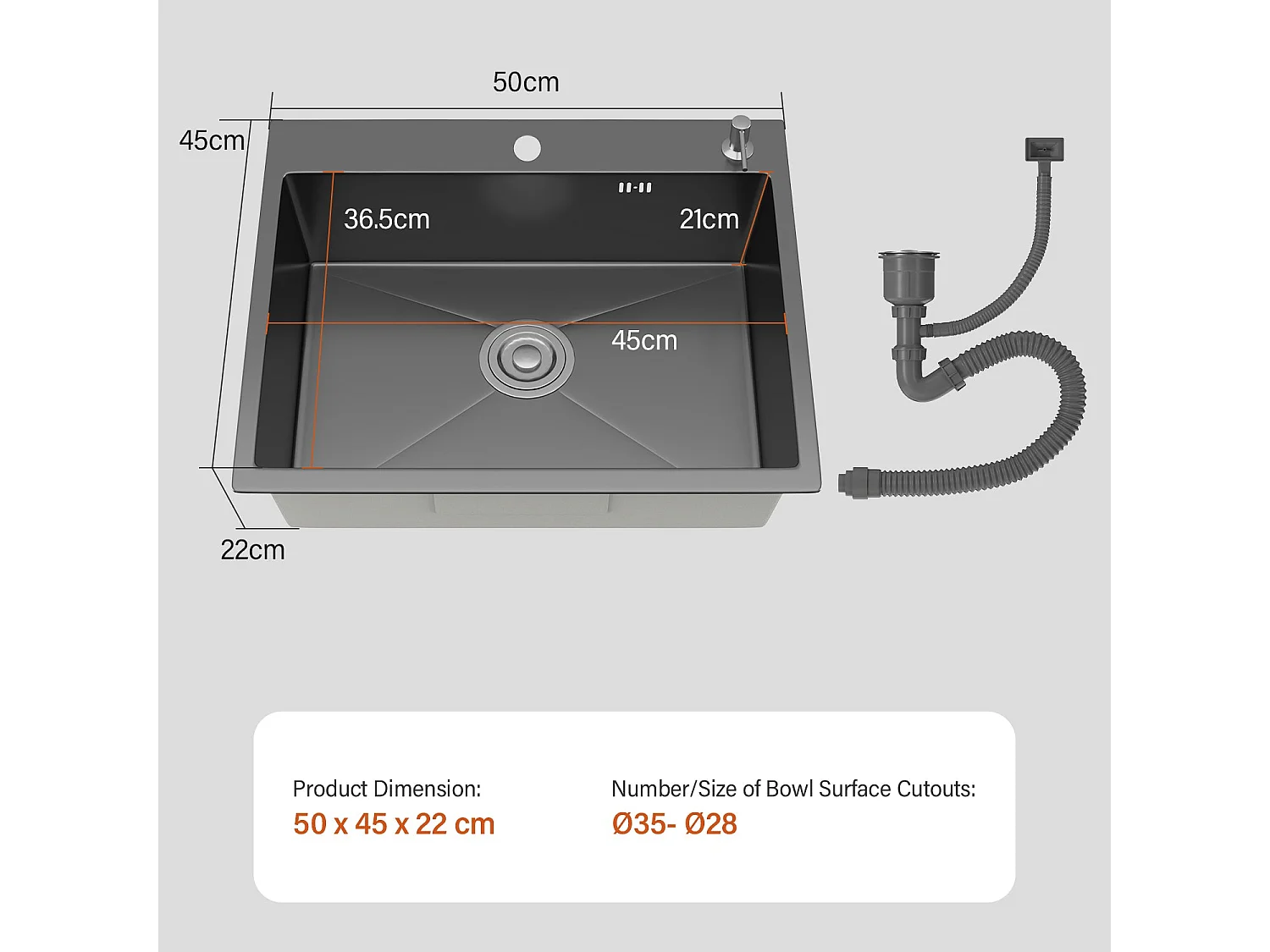 Évier Inox 1 Bac 50x45x22 cm Gris Métallisé - pour Petite Cuisine & Camping-car - Prépercé avec Filtre