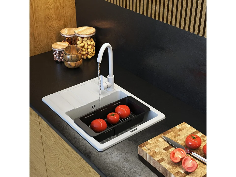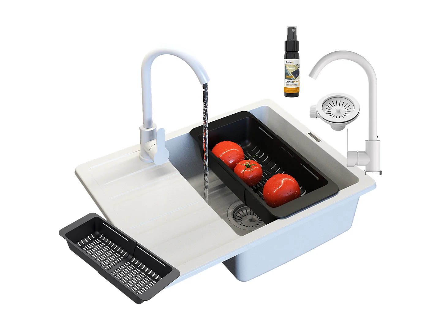 ÉVIER MONOCUVE EN GRANIT ROBINET SIPHON BLANC PANIER PAROS