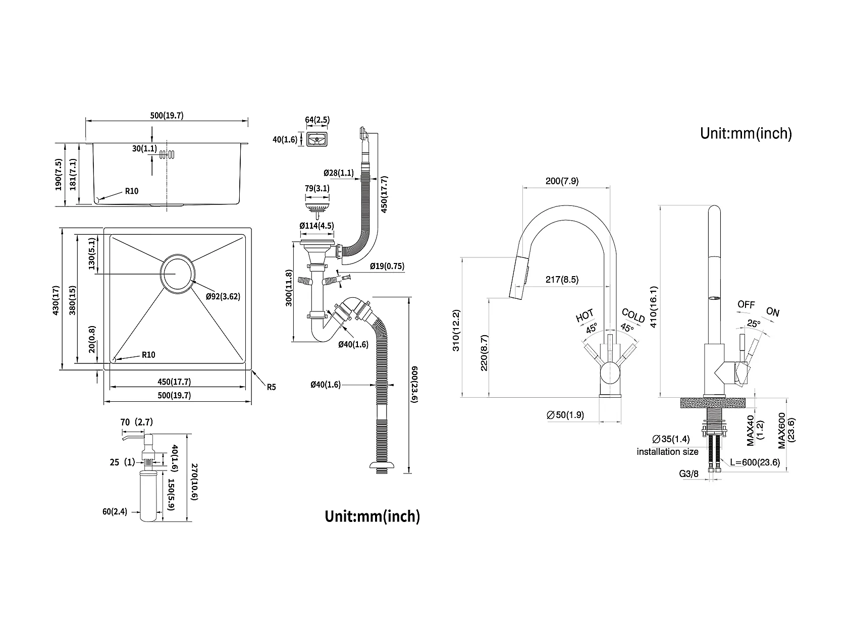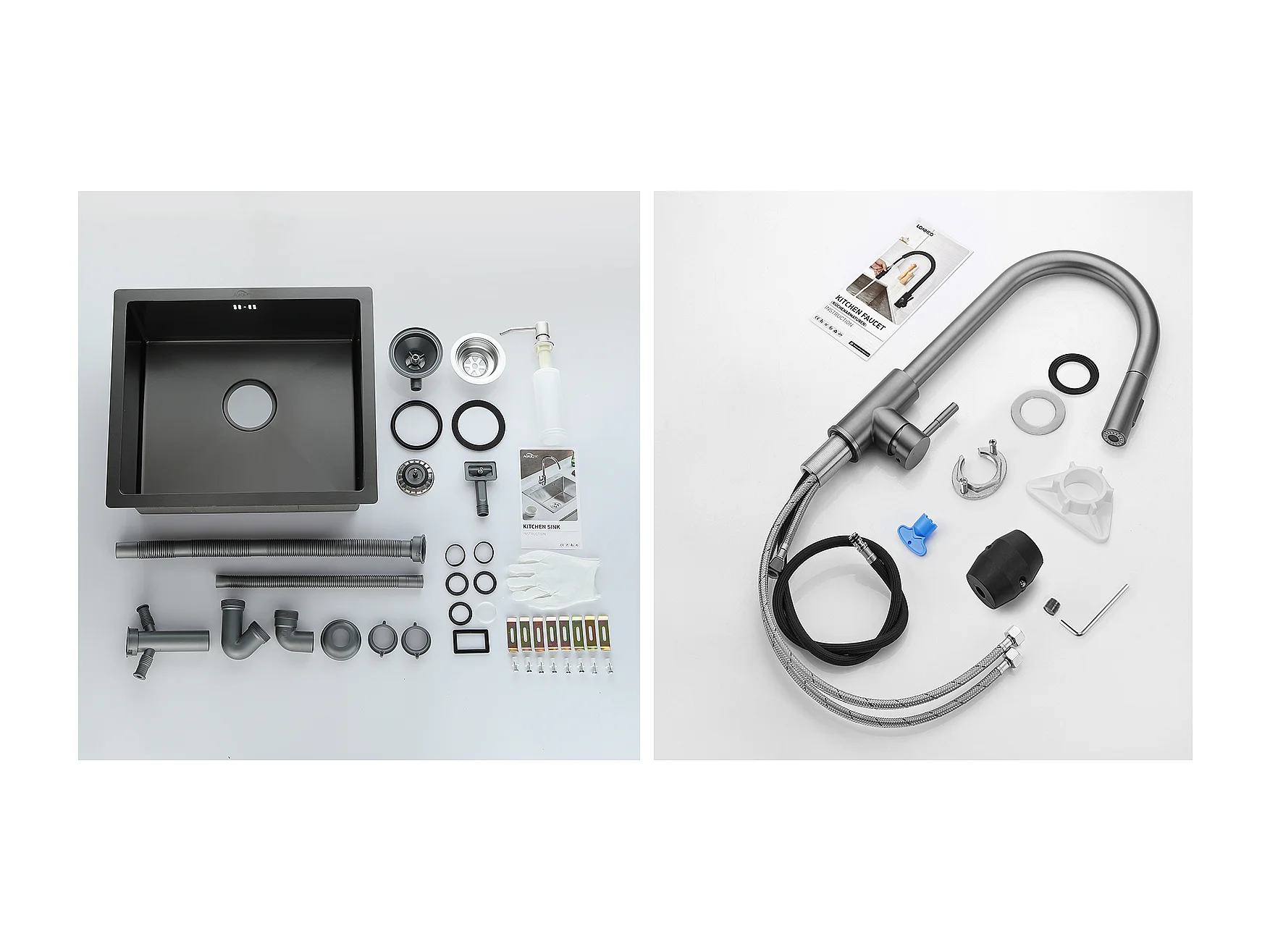 Évier Noir 1 Bac 50x43x18,5CM,Acier Inoxydable, avec Distrubuteur de savon+Robinet Cuisine Douchette Extractible Gris Foncé Rotatif 360 °