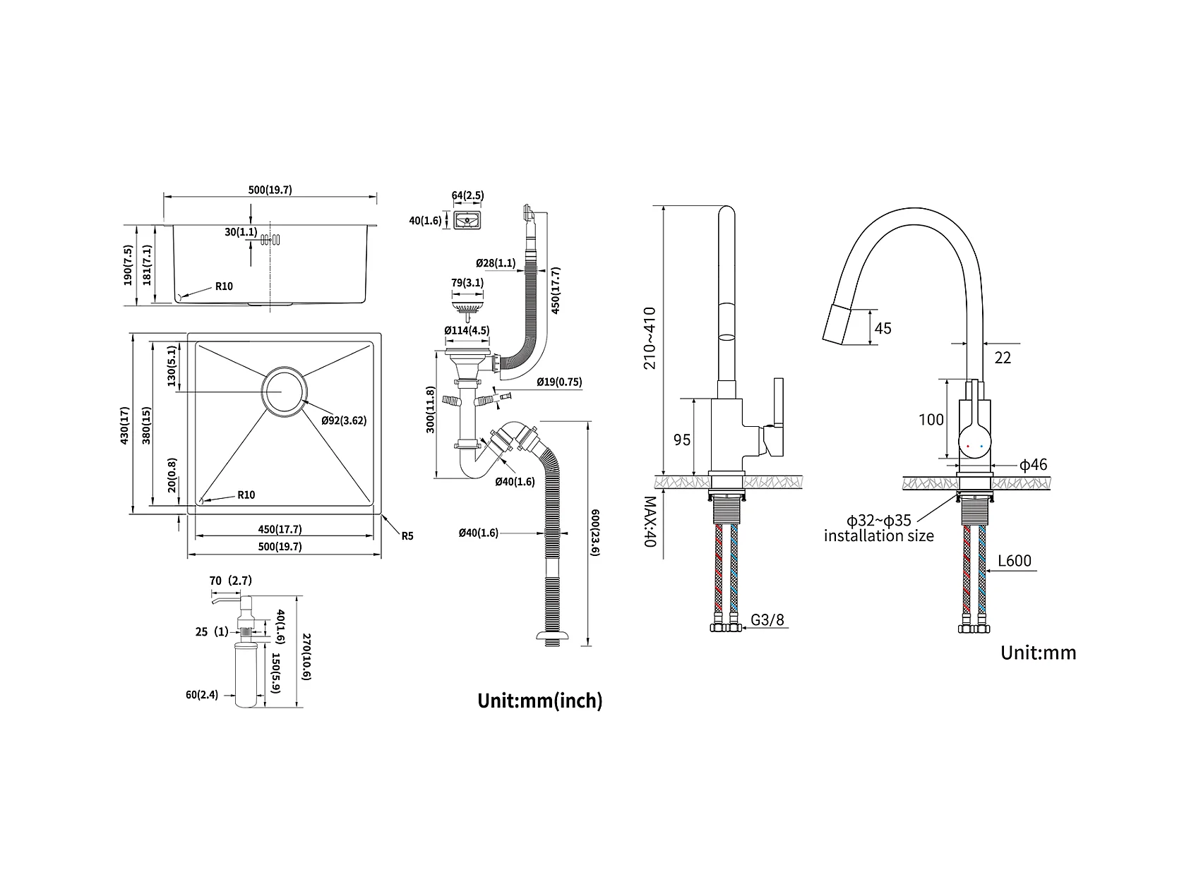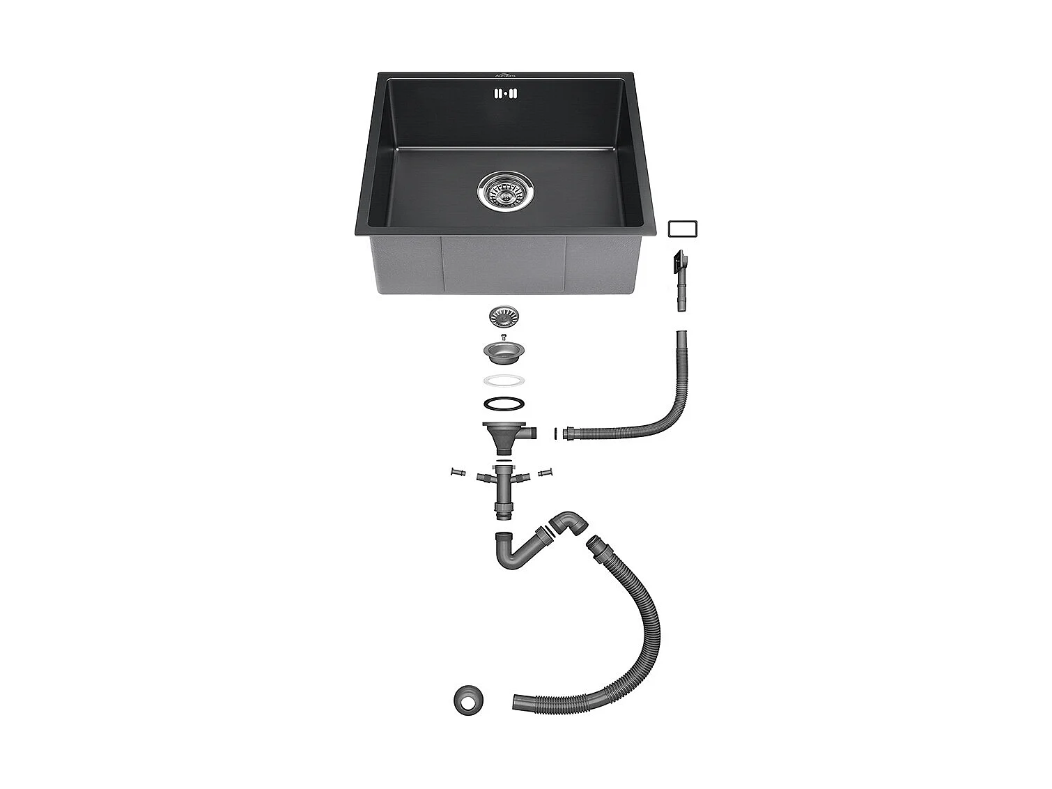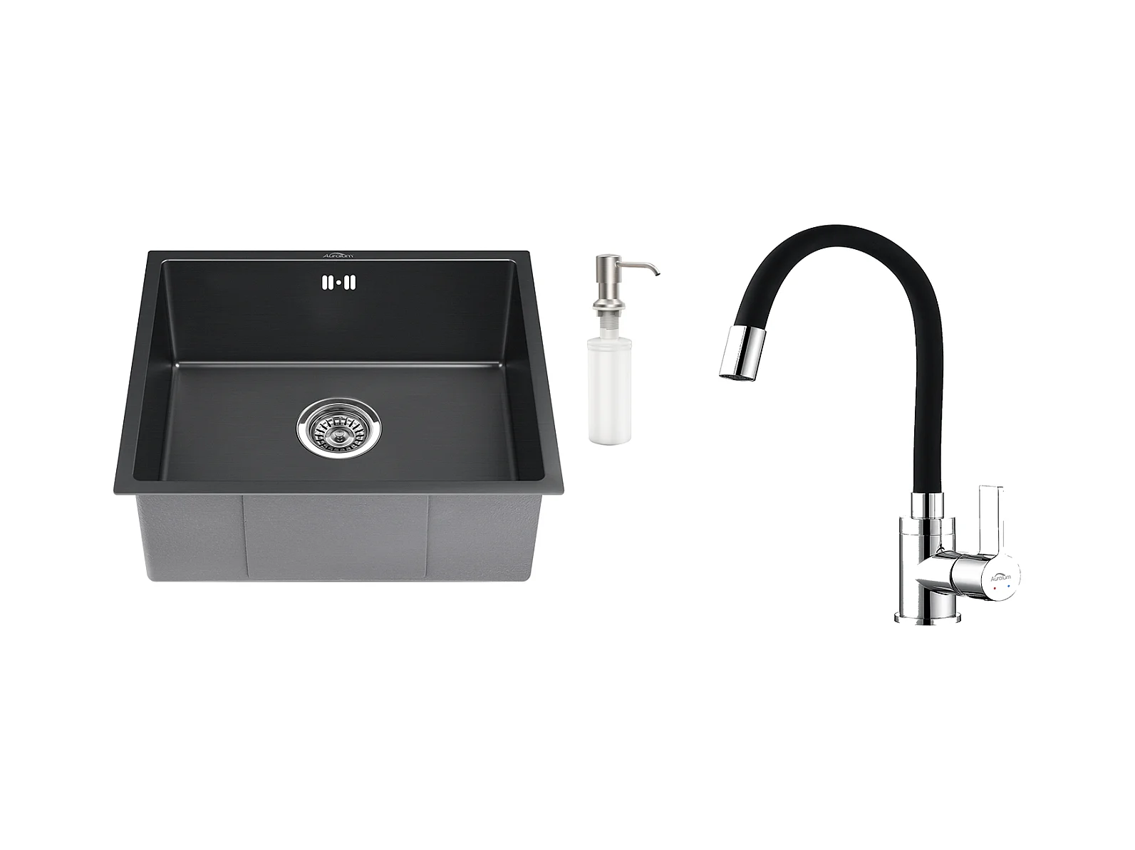 Évier Noir 1 Bac 50x43x18,5CM,avec Distrubuteur de savon++Robinet de Cuisine Flexible Bec Haut Orientable