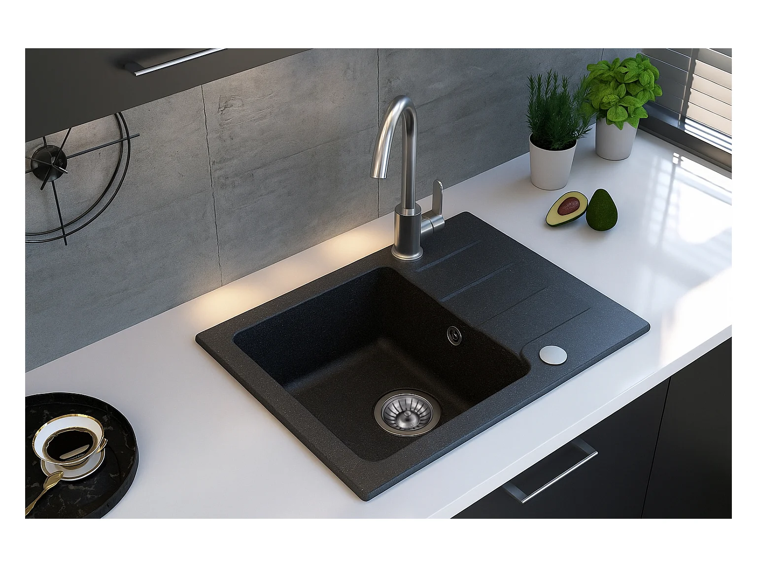 ÉVIER EN GRANIT ÉGOUTTOIR NOIR + SIPHON DOUCHETTE CHROMÉE
