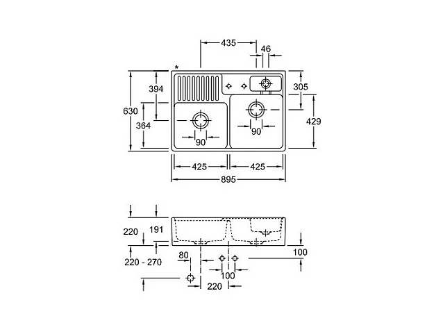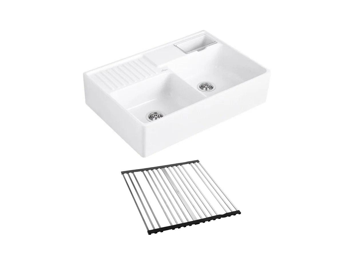 Evier timbre d'office VILLEROY ET BOCH Tradition 2 bacs 89,5 x 63 céramique vidage auto blanc + Egouttoir déroulable