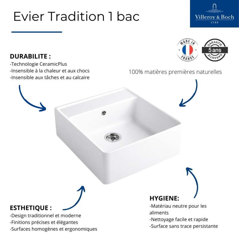 Evier timbre office VILLEROY ET BOCH Tradition Creme CeramicPlus avec vidage automatique