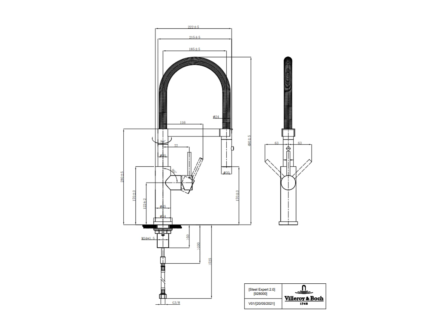 Evier VILLEROY ET BOCH Subway Pure 60 1 bac et demi égouttoir à droite vidage auto + Robinet Steel Expert 2.0 Acier Massif