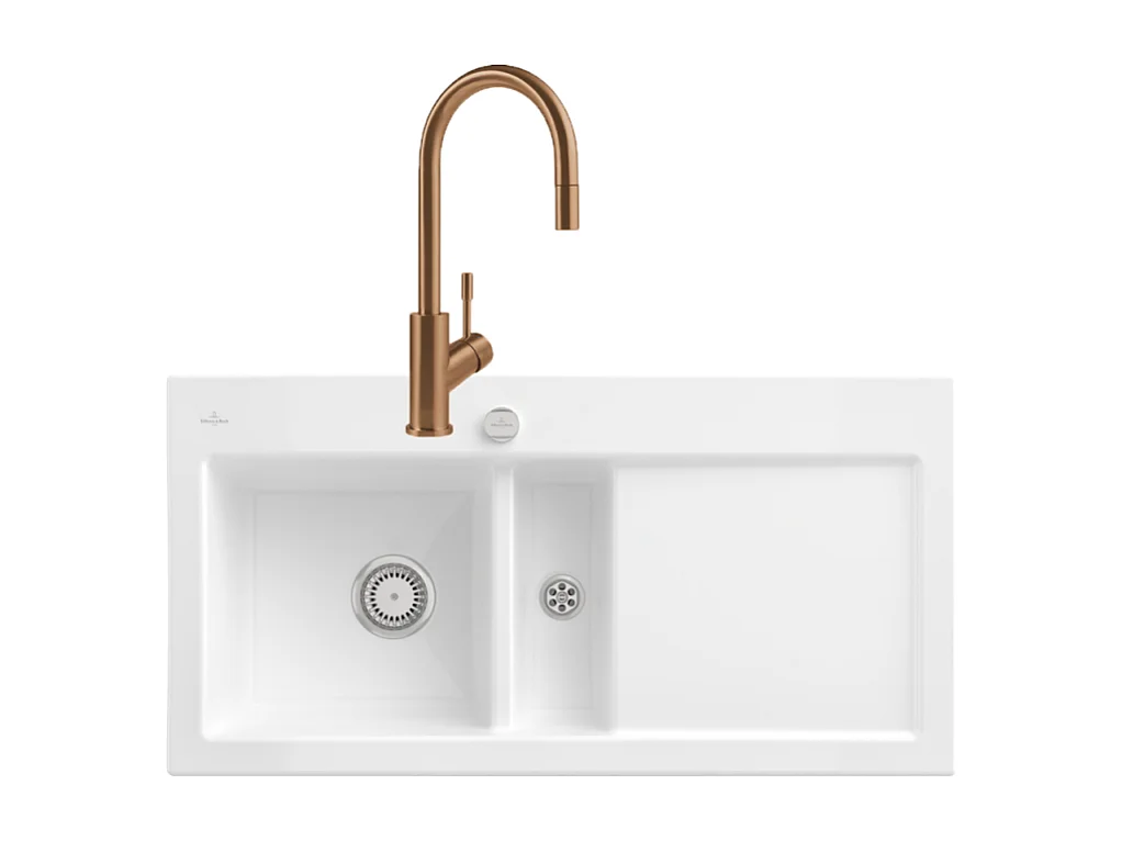 Evier VILLEROY ET BOCH Subway Pure 60 1 bac et demi égouttoir à droite vidage auto + Robinet Umbrella Flex Bronze