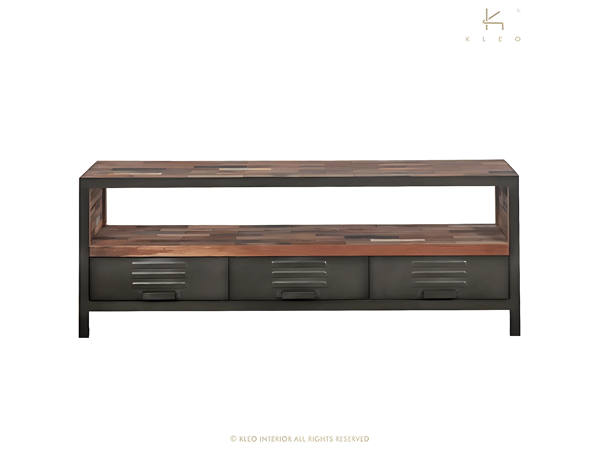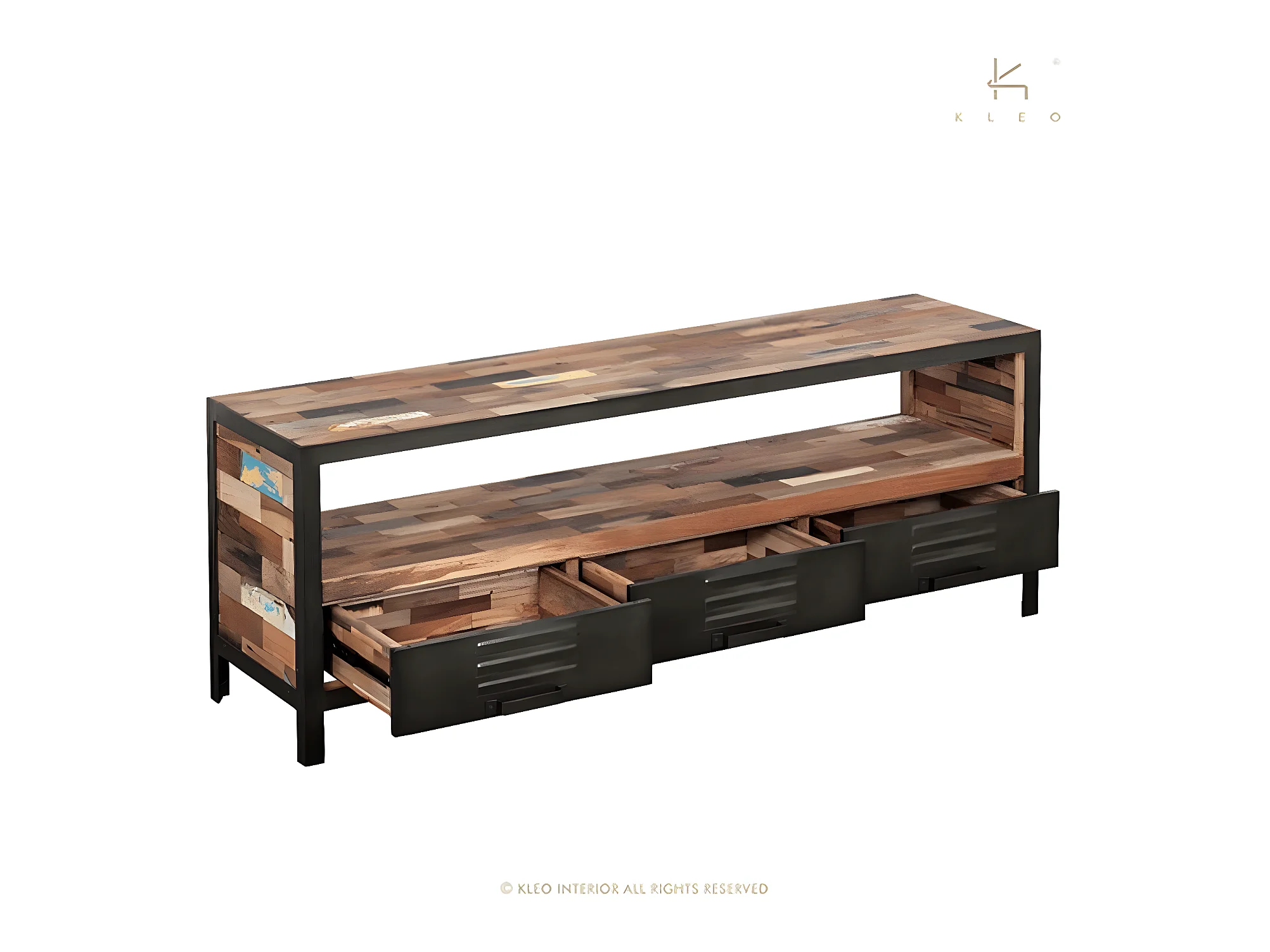Factory meuble TV en bois de bateau recyclé - 1 Niche de rangement - 3 Tiroirs - Portes en métal noir - Style Industriel - L160
