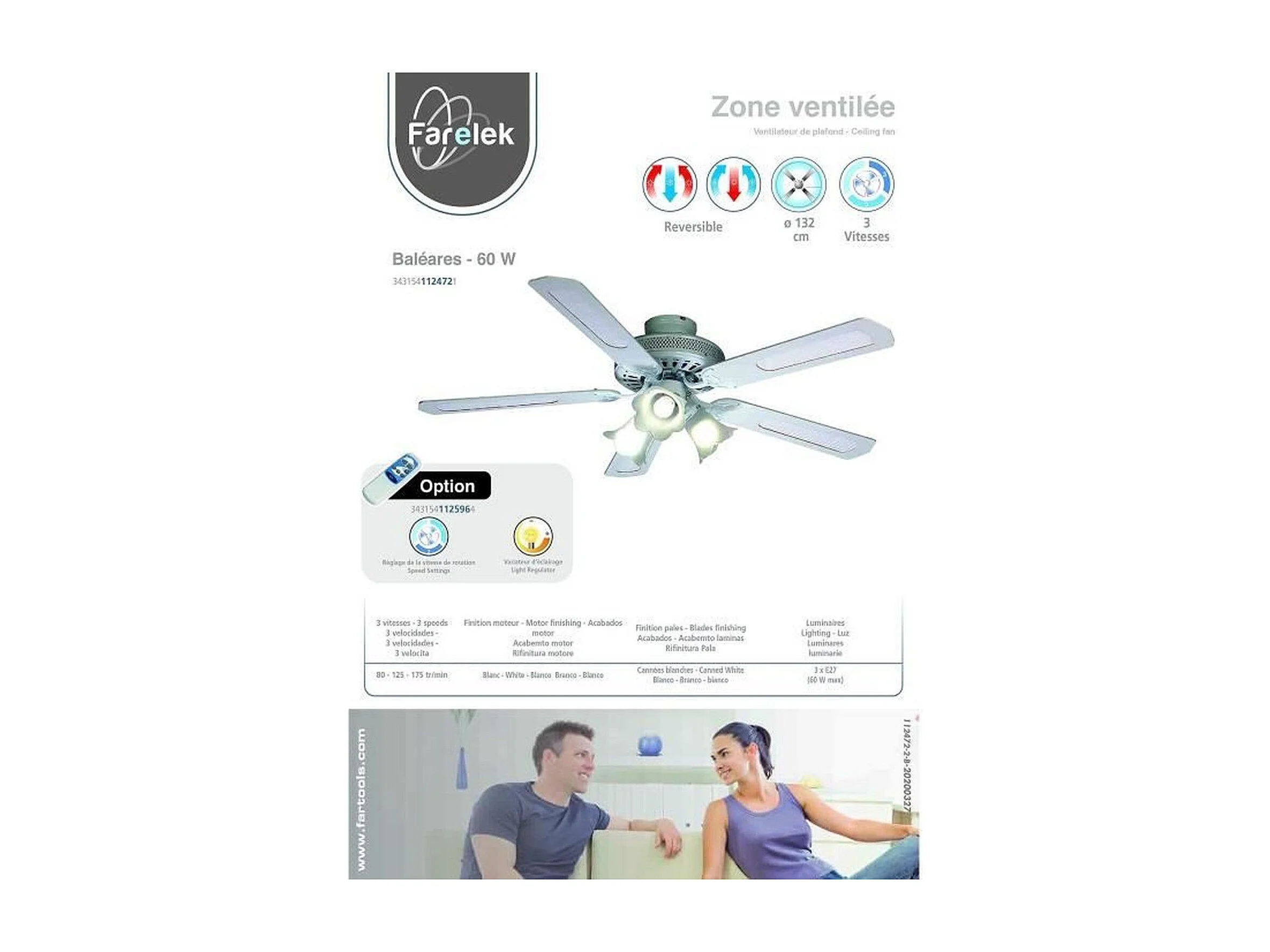 FARELEK - BALEARES O 132 cm - Ventilateur de plafond reversible, 5 pales blanches / cannees blanches + eclairage
