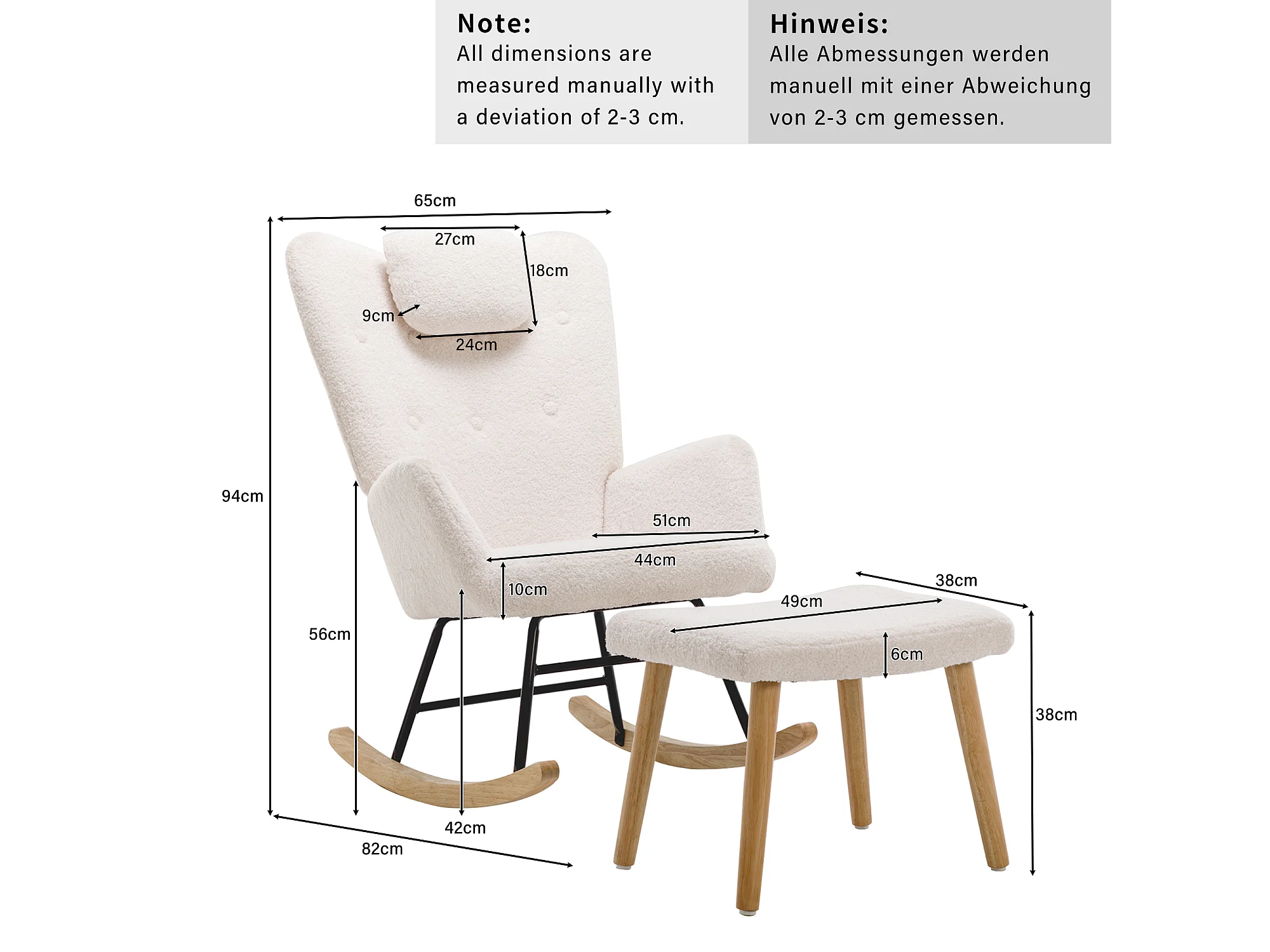 Fauteuil à bascule capitonné, rocking chair avec Appuie-tête et tabouret, cadre en métal et pieds en bois, tissu en Teddy blanc